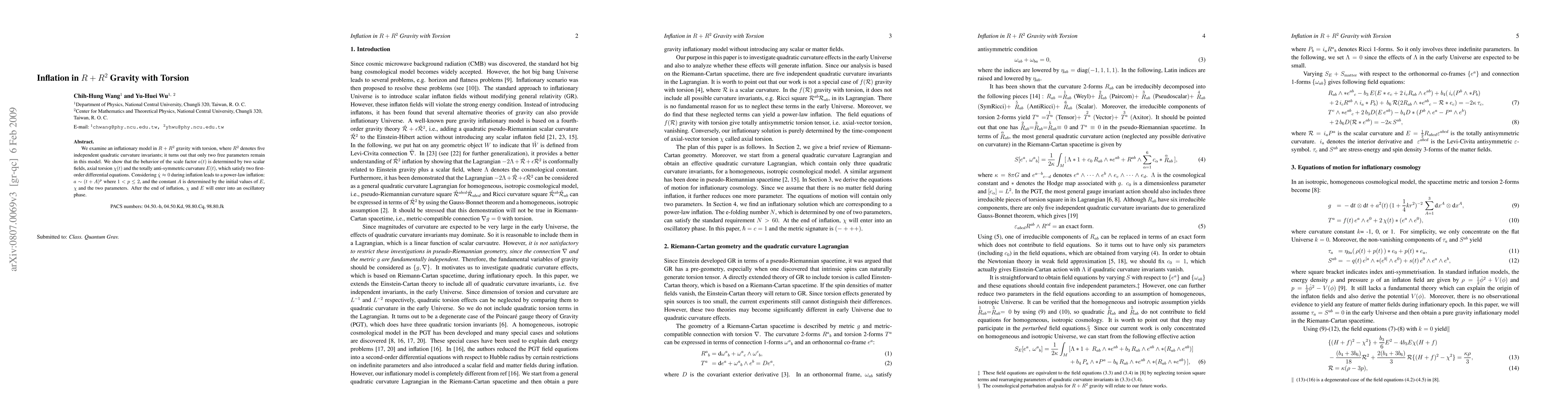 This paper explores an inflationary model in $R + R^2$ gravity with torsion, demonstrating that only two free parameters remain. The scale factor $a(t)$ is driven by two scalar fields, axial torsion $\chi(t)$ and the totally anti-symmetric curvature $E(t)$, leading to a power-law inflation $a \sim (t+ A)^p$ with $1< p \leq 2$. Post-inflation, $\chi$ and $E$ transition into an oscillatory phase.