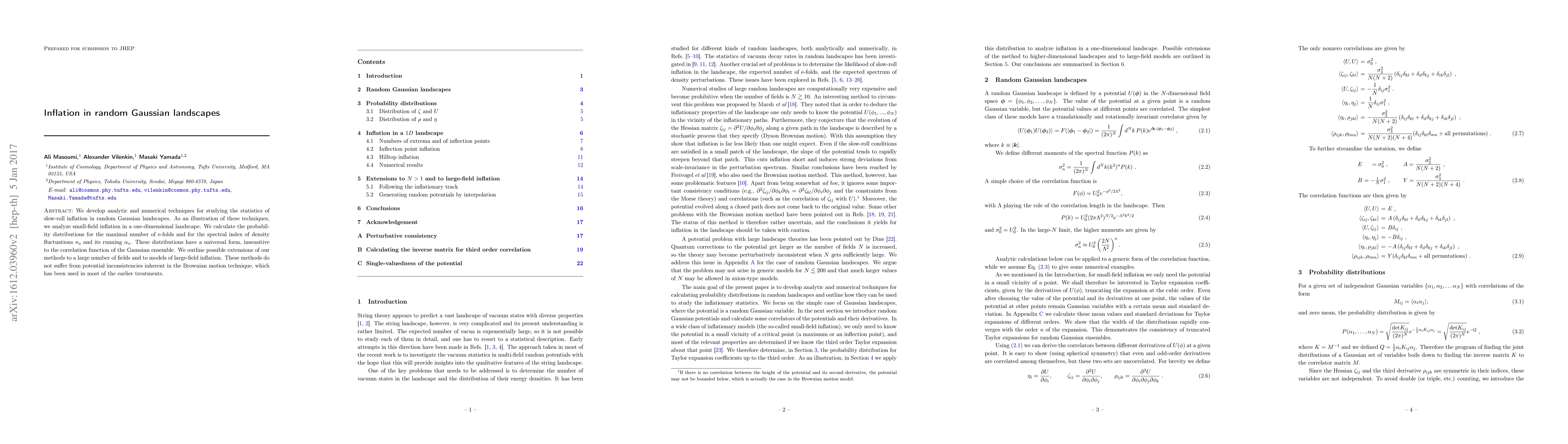 This paper develops new analytic and numerical methods to study slow-roll inflation in random Gaussian landscapes, focusing on small-field inflation. It calculates universal probability distributions for e-folds, spectral index, and its running, free from inconsistencies of previous techniques.