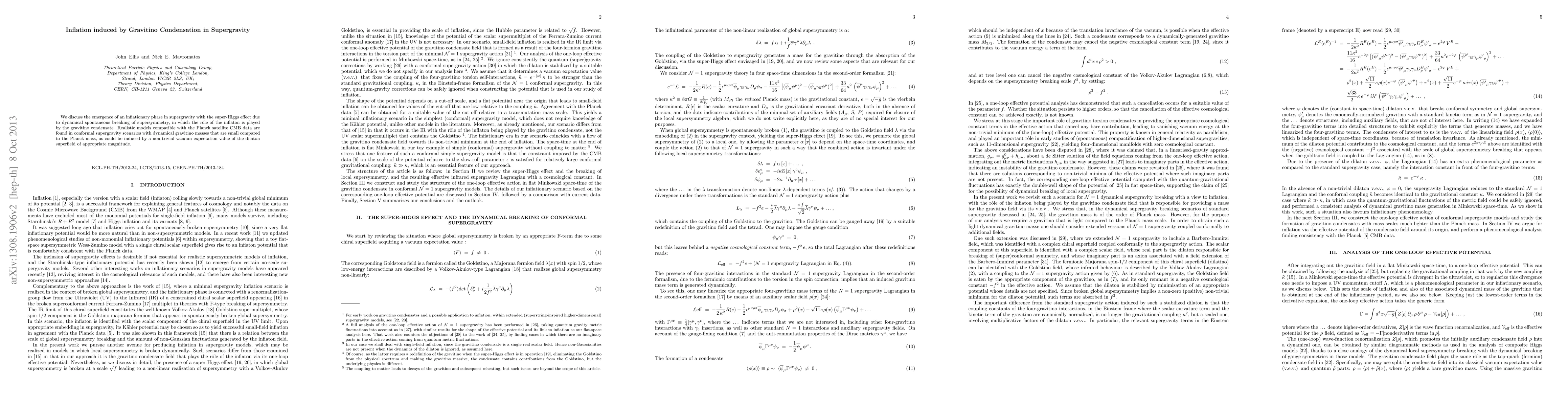 We discuss the emergence of an inflationary phase in supergravity with the super-Higgs effect due to dynamical spontaneous breaking of supersymmetry, in which the role of the inflaton is played by the gravitino condensate. Realistic models compatible with the Planck satellite CMB data are found in conformal supergravity scenarios with dynamical gravitino masses that are small compared to the Planck mass, as could be induced by a non-trivial vacuum expectation value of the dilaton superfield of appropriate magnitude.