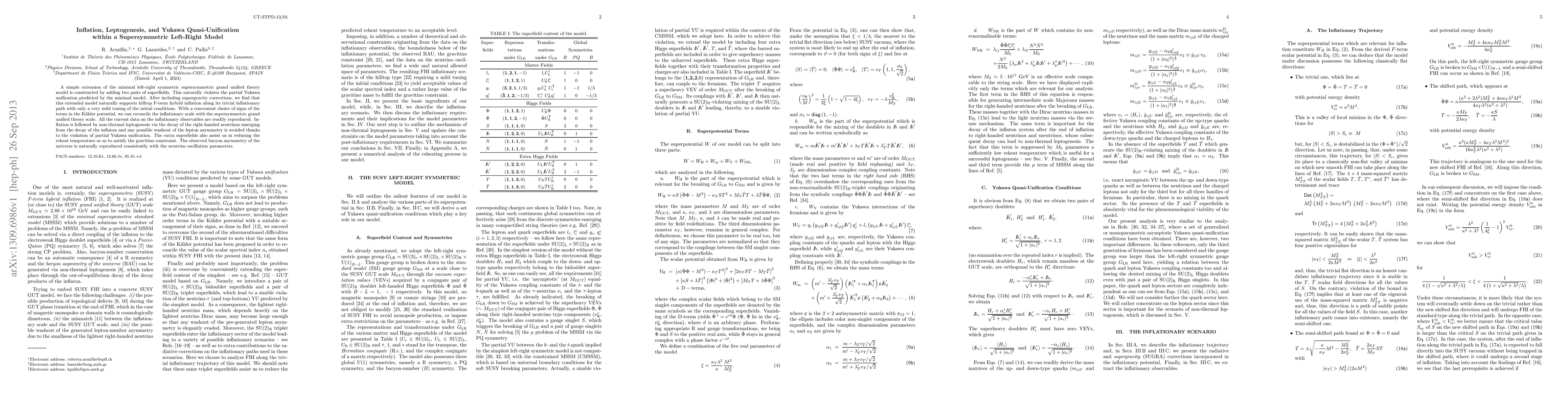 This research constructs an extended supersymmetric left-right model that supports hilltop F-term hybrid inflation and naturally aligns with inflationary observables. It also incorporates non-thermal leptogenesis and Yukawa quasi-unification, resolving the gravitino constraint and reproducing the observed baryon asymmetry.