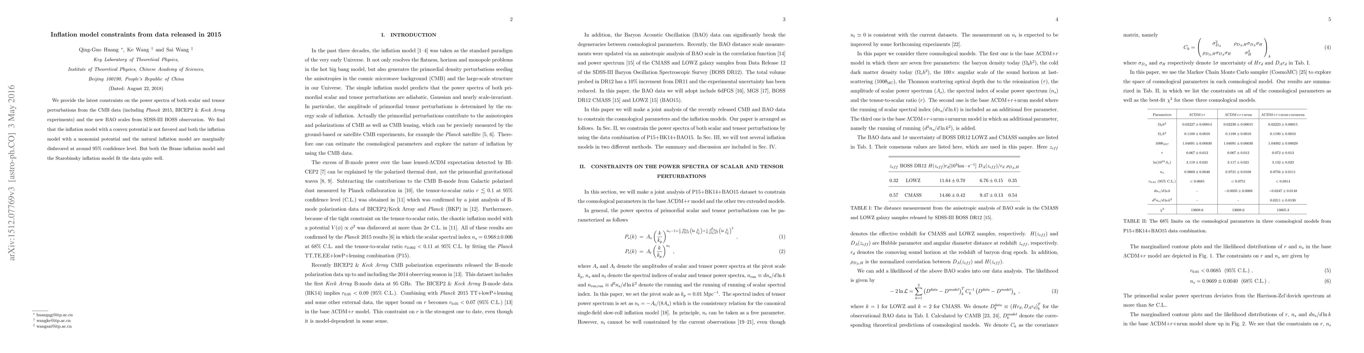 We provide the latest constraints on the power spectra of both scalar and tensor perturbations from the CMB data (including \textit{Planck}~2015, BICEP2 \& \textit{Keck Array} experiments) and the new BAO scales from SDSS-III BOSS observation. We find that the inflation model with a convex potential is not favored and both the inflation model with a monomial potential and the natural inflation model are marginally disfavored at around $95\%$ confidence level. But both the Brane inflation model and the Starobinsky inflation model fit the data quite well.