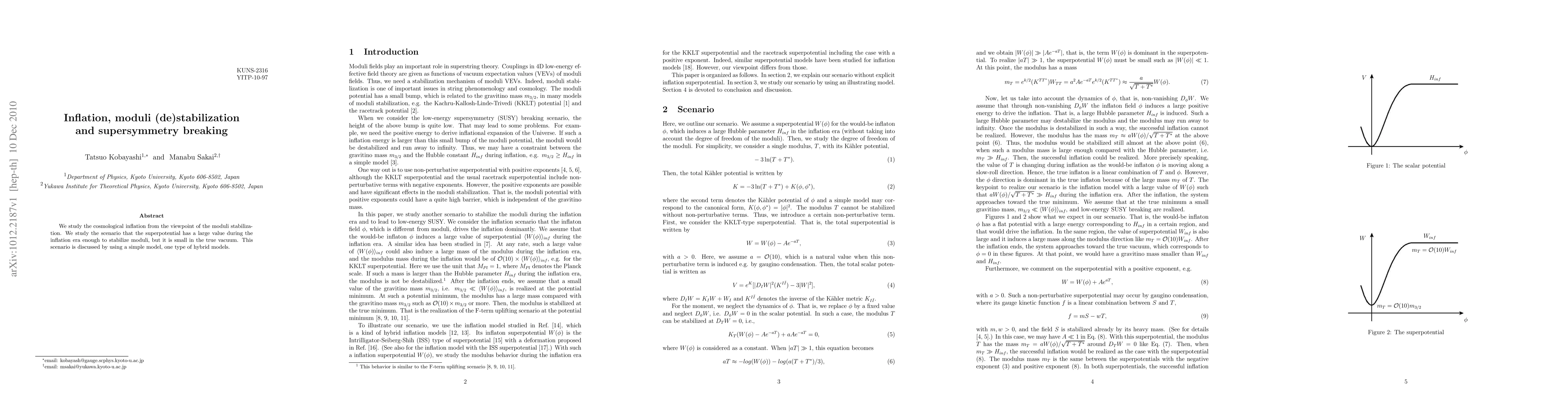 This paper investigates cosmological inflation through the lens of moduli stabilization, proposing a hybrid model where a large superpotential value during inflation stabilizes moduli, contrasting with its small value in the true vacuum state.