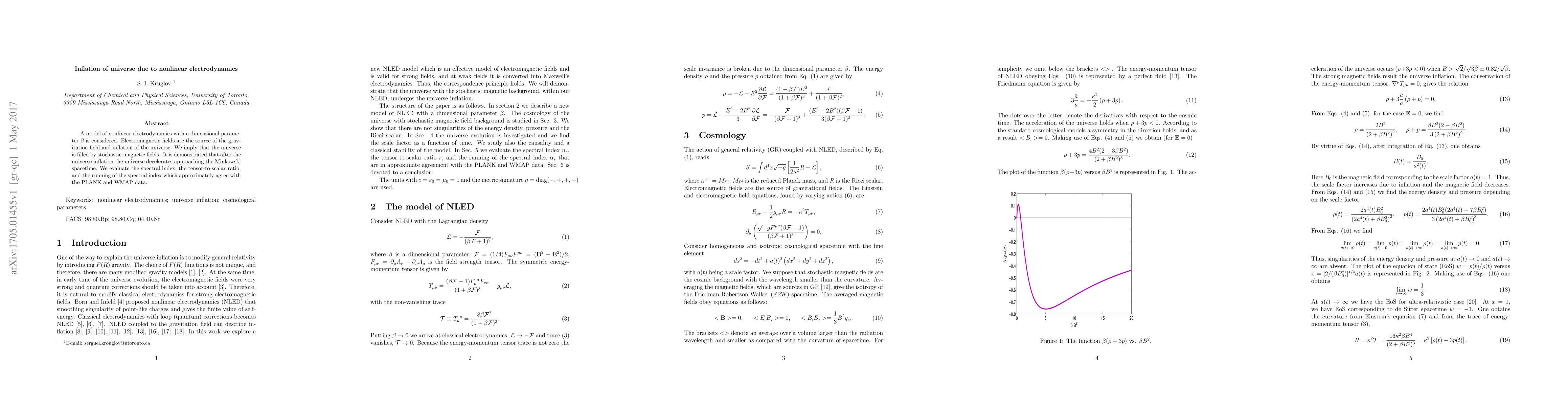 A model of nonlinear electrodynamics with a dimensional parameter $\beta$ is considered. Electromagnetic fields are the source of the gravitation field and inflation of the universe. We imply that the universe is filled by stochastic magnetic fields. It is demonstrated that after the universe inflation the universe decelerates approaching the Minkowski spacetime. We evaluate the spectral index, the tensor-to-scalar ratio, and the running of the spectral index which approximately agree with the PLANK and WMAP data.