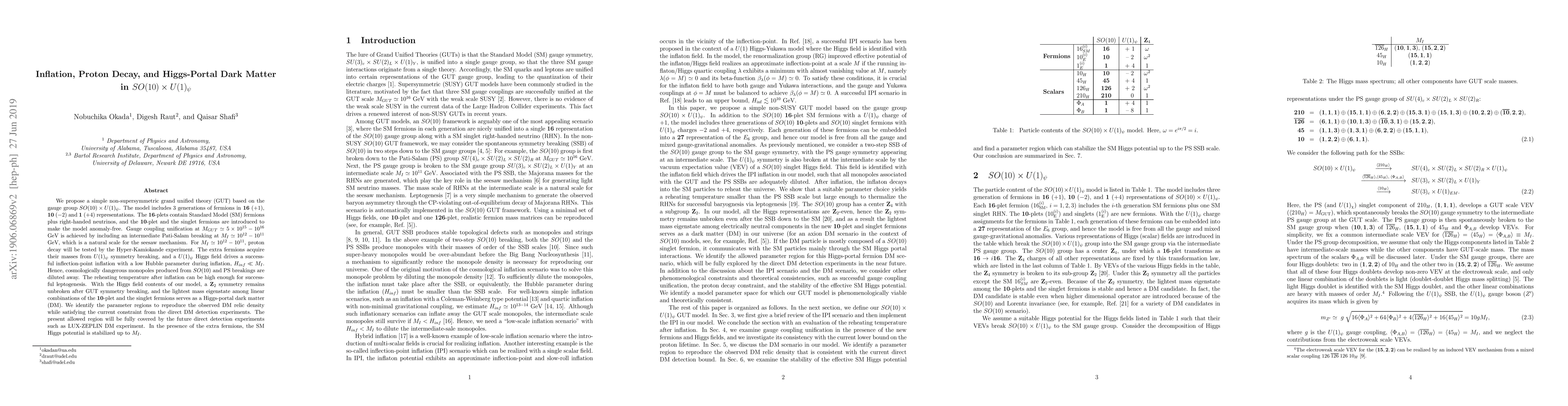 We propose a simple non-supersymmetric grand unified theory (GUT) based on the gauge group $SO(10) \times U(1)_\psi$. The model includes 3 generations of fermions in ${\bf 16}$ ($+1$), ${\bf 10}$ ($-2$) and ${\bf 1}$ ($+4$) representations. The ${\bf 16}$-plets contain Standard Model (SM) fermions plus right-handed neutrinos, and the ${\bf 10}$-plet and the singlet fermions are introduced to make the model anomaly-free. Gauge coupling unification at $M_{GUT} \simeq 5 \times 10^{15}-10^{16}$ GeV is achieved by including an intermediate Pati-Salam breaking at $M_{I} \simeq 10^{12}-10^{11}$ GeV, which is a natural scale for the seesaw mechanism. For $M_{I} \simeq 10^{12}-10^{11}$, proton decay will be tested by the Hyper-Kamiokande experiment. The extra fermions acquire their masses from $U(1)_\psi$ symmetry breaking, and a $U(1)_\psi$ Higgs field drives a successful inflection-point inflation with a low Hubble parameter during inflation, $H_{inf} \ll M_{I}$. Hence, cosmologically dangerous monopoles produced from $SO(10)$ and PS breakings are diluted away. The reheating temperature after inflation can be high enough for successful leptogenesis. With the Higgs field contents of our model, a ${\bf Z}_2$ symmetry remains unbroken after GUT symmetry breaking, and the lightest mass eigenstate among linear combinations of the ${\bf 10}$-plet and the singlet fermions serves as a Higgs-portal dark matter (DM). We identify the parameter regions to reproduce the observed DM relic density while satisfying the current constraint from the direct DM detection experiments. The present allowed region will be fully covered by the future direct detection experiments such as LUX-ZEPLIN DM experiment. In the presence of the extra fermions, the SM Higgs potential is stabilized up to $M_{I}$.