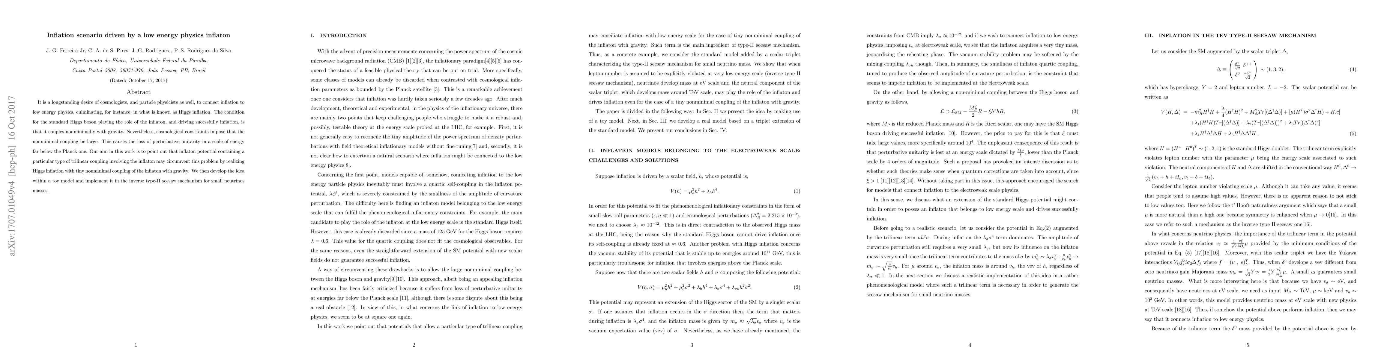 This paper explores a low energy physics model for inflation, specifically Higgs inflation, where the Higgs boson acts as the inflaton. It proposes a trilinear coupling in the inflaton potential to maintain perturbative unitarity without requiring a large nonminimal coupling with gravity, thereby addressing cosmological constraints.