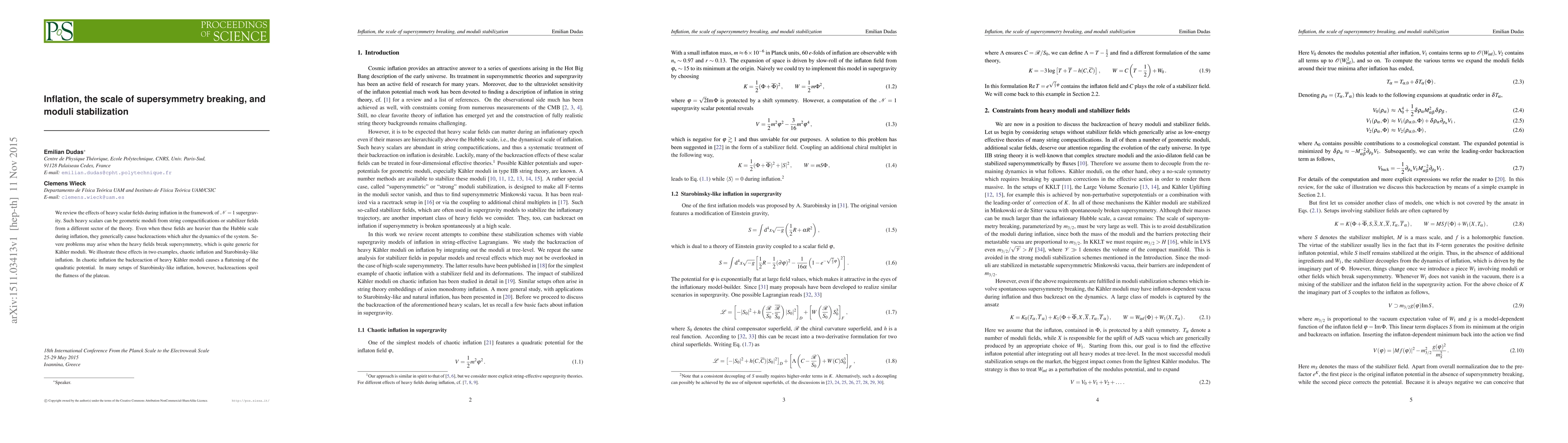 We review the effects of heavy scalar fields during inflation in the framework of $\mathcal N = 1$ supergravity. Such heavy scalars can be geometric moduli from string compactifications or stabilizer fields from a different sector of the theory. Even when these fields are heavier than the Hubble scale during inflation, they generically cause backreactions which alter the dynamics of the system. Severe problems may arise when the heavy fields break supersymmetry, which is quite generic for K\"ahler moduli. We illustrate these effects in two examples, chaotic inflation and Starobinsky-like inflation. In chaotic inflation the backreaction of heavy K\"ahler moduli causes a flattening of the quadratic potential. In many setups of Starobinsky-like inflation, however, backreactions spoil the flatness of the plateau.