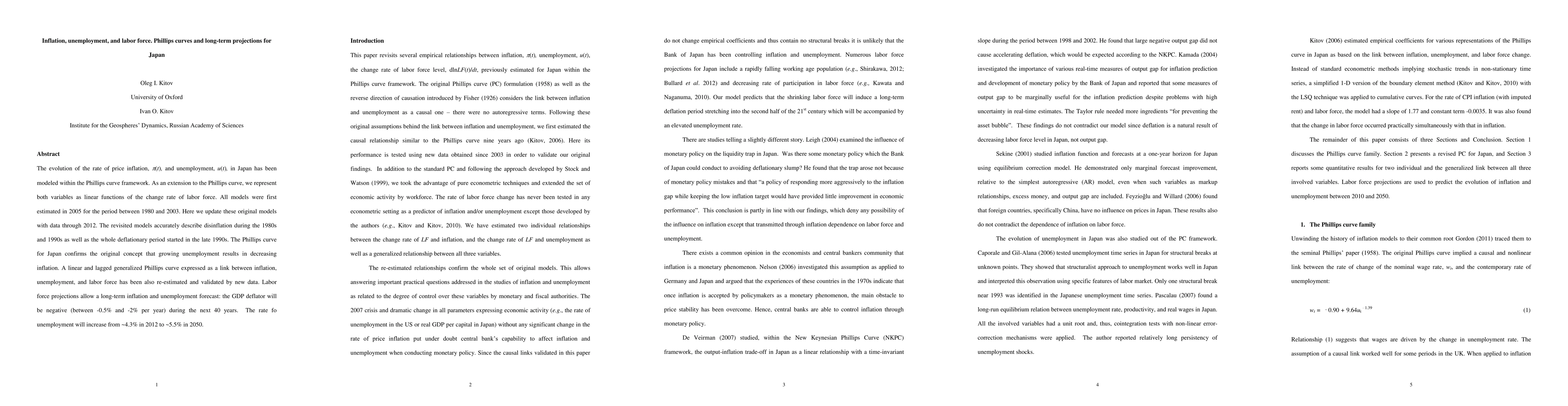 The evolution of the rate of price inflation and unemployment in Japan has been modeled within the Phillips curve framework. As an extension to the Phillips curve, we represent both variables as linear functions of the change rate of labor force. All models were first estimated in 2005 for the period between 1980 and 2003. Here we update these original models with data through 2012. The revisited models accurately describe disinflation during the 1980s and 1990s as well as the whole deflationary period started in the late 1990s. The Phillips curve for Japan confirms the original concept that growing unemployment results in decreasing inflation. A linear and lagged generalized Phillips curve expressed as a link between inflation, unemployment, and labor force has been also re-estimated and validated by new data. Labor force projections allow a long-term inflation and unemployment forecast: the GDP deflator will be negative (between -0.5% and -2% per year) during the next 40 years. The rate of unemployment will increase from 4.3% in 2012 to 5.5% in 2050.