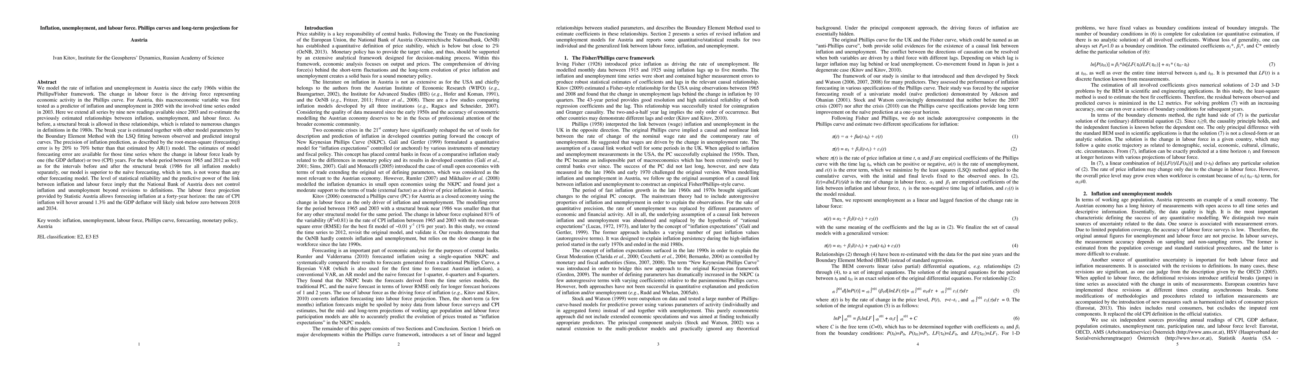 We model the rate of inflation and unemployment in Austria since the early 1960s within the Phillips/Fisher framework. The change in labour force is the driving force representing economic activity in the Phillips curve. For Austria, this macroeconomic variable was first tested as a predictor of inflation and unemployment in 2005 with the involved time series ended in 2003. Here we extend all series by nine new readings available since 2003 and re-estimate the previously estimated relationships between inflation, unemployment, and labour force. As before, a structural break is allowed in these relationships, which is related to numerous changes in definitions in the 1980s. The break year is estimated together with other model parameters by the Boundary Element Method with the LSQ fitting between observed and predicted integral curves. The precision of inflation prediction, as described by the root-mean-square (forecasting) error is by 20% to 70% better than that estimated by AR(1) model. The estimates of model forecasting error are available for those time series where the change in labour force leads by one (the GDP deflator) or two (CPI) years. For the whole period between 1965 and 2012 as well as for the intervals before and after the structural break (1986 for all inflation models) separately, our model is superior to the na\"ive forecasting, which in turn, is not worse than any other forecasting model. The level of statistical reliability and the predictive power of the link between inflation and labour force imply that the National Bank of Austria does not control inflation and unemployment beyond revisions to definitions. The labour force projection provided by Statistic Austria allows foreseeing inflation at a forty-year horizon: the rate of CPI inflation will hover around 1.3% and the GDP deflator will likely sink below zero between 2018 and 2034.