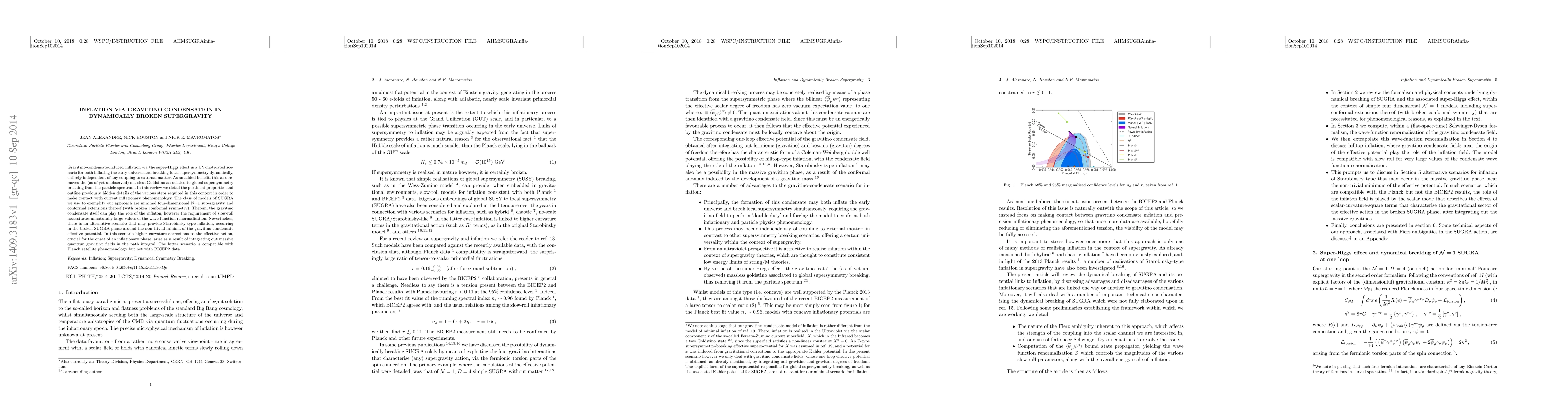 The paper reviews a scenario of inflation via gravitino condensation in dynamically broken supergravity, detailing the steps required for this process and making contact with current inflationary phenomenology using minimal four-dimensional N=1 supergravity and conformal extensions thereof.