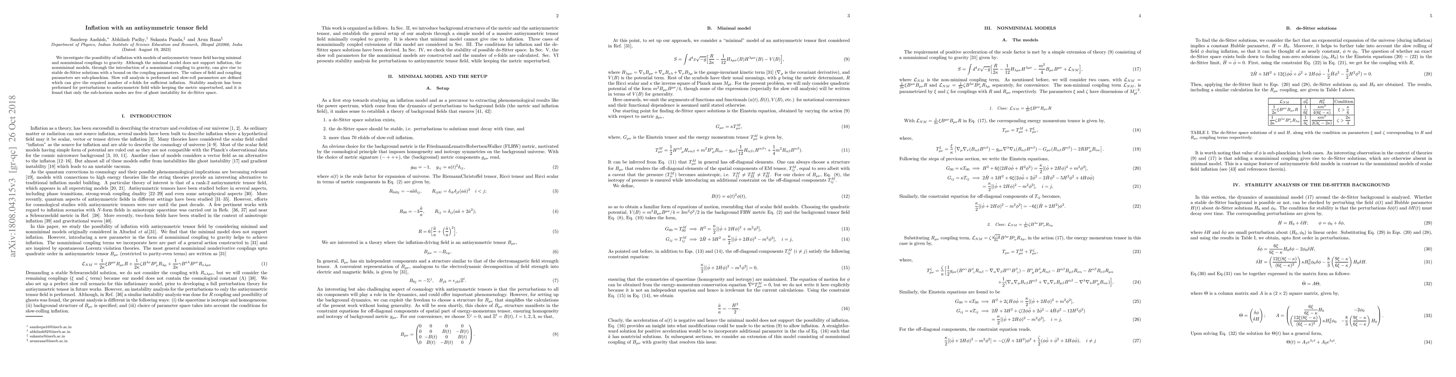 This paper explores inflationary models using antisymmetric tensor fields with minimal and nonminimal couplings to gravity, finding that only nonminimal models can support stable inflation. The study defines slow-roll parameters to achieve the required number of e-folds and confirms that only sub-horizon modes avoid ghost instabilities.