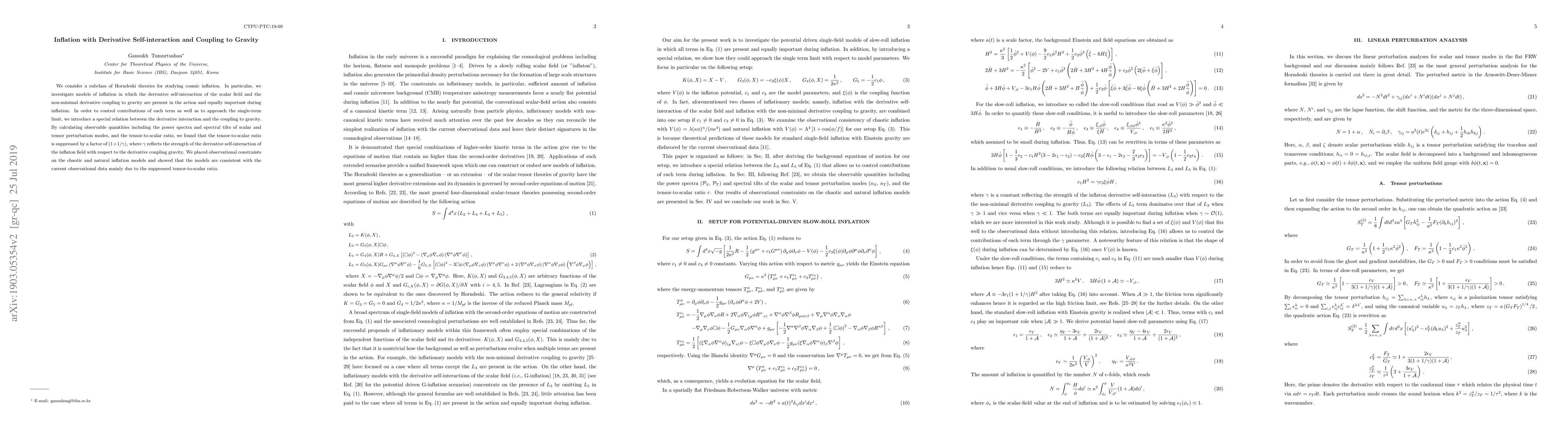 This paper explores a subclass of Horndeski theories for cosmic inflation, focusing on models with derivative self-interactions and non-minimal derivative couplings to gravity. It finds that the tensor-to-scalar ratio is suppressed by a factor of $(1+1/\gamma)$, allowing the models to be consistent with observational data.