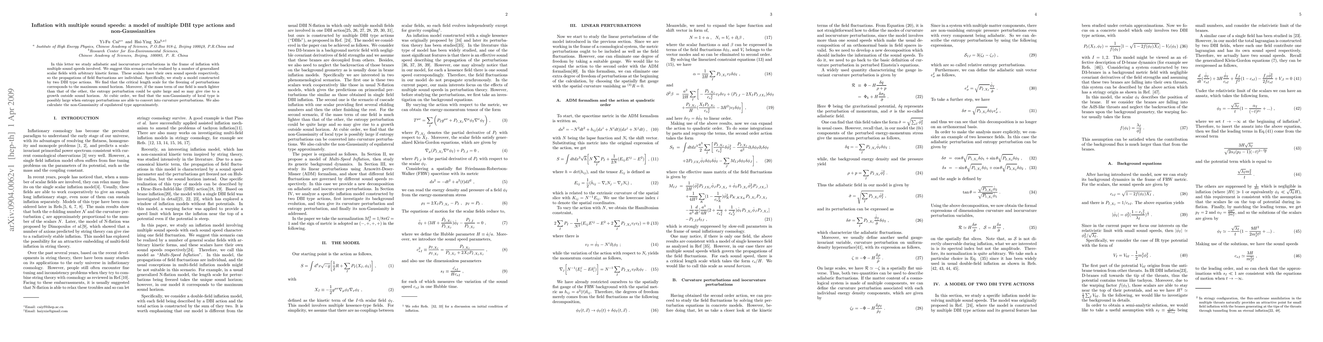 In this letter we study adiabatic and isocurvature perturbations in the frame of inflation with multiple sound speeds involved. We suggest this scenario can be realized by a number of generalized scalar fields with arbitrary kinetic forms. These scalars have their own sound speeds respectively, so the propagations of field fluctuations are individual. Specifically, we study a model constructed by two DBI type actions. We find that the critical length scale for the freezing of perturbations corresponds to the maximum sound horizon. Moreover, if the mass term of one field is much lighter than that of the other, the entropy perturbation could be quite large and so may give rise to a growth outside sound horizon. At cubic order, we find that the non-Gaussianity of local type is possibly large when entropy perturbations are able to convert into curvature perturbations. We also calculate the non-Gaussianity of equilateral type approximately.