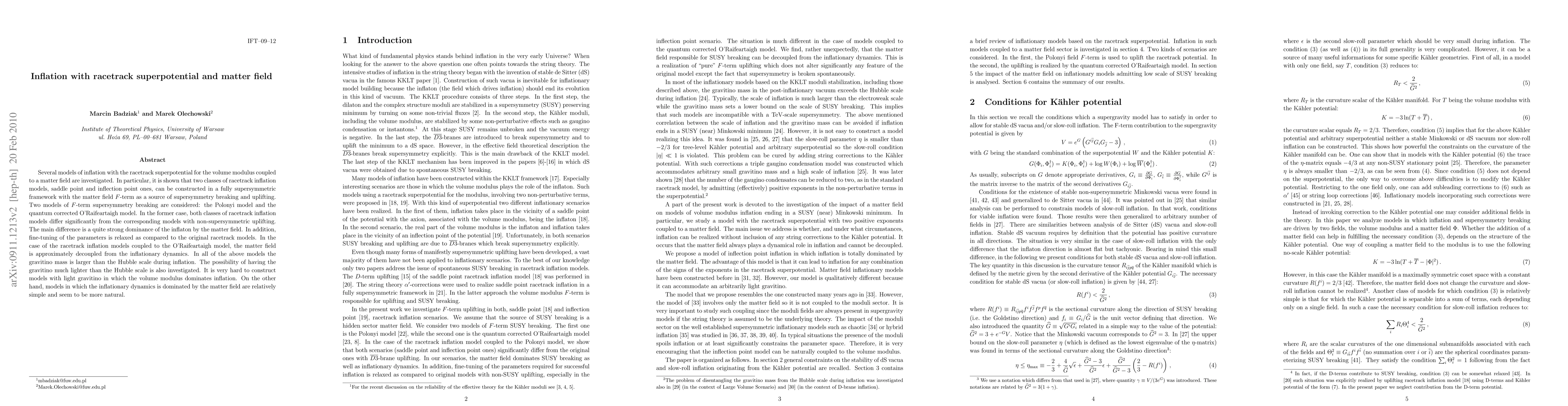 Several models of inflation with the racetrack superpotential for the volume modulus coupled to a matter field are investigated. In particular, it is shown that two classes of racetrack inflation models, saddle point and inflection point ones, can be constructed in a fully supersymmetric framework with the matter field F-term as a source of supersymmetry breaking and uplifting. Two models of F-term supersymmetry breaking are considered: the Polonyi model and the quantum corrected O'Raifeartaigh model. In the former case, both classes of racetrack inflation models differ significantly from the corresponding models with non-supersymmetric uplifting. The main difference is a quite strong dominance of the inflaton by the matter field. In addition, fine-tuning of the parameters is relaxed as compared to the original racetrack models. In the case of the racetrack inflation models coupled to the O'Raifeartaigh model, the matter field is approximately decoupled from the inflationary dynamics. In all of the above models the gravitino mass is larger than the Hubble scale during inflation. The possibility of having the gravitino much lighter than the Hubble scale is also investigated. It is very hard to construct models with light gravitino in which the volume modulus dominates inflation. On the other hand, models in which the inflationary dynamics is dominated by the matter field are relatively simple and seem to be more natural.