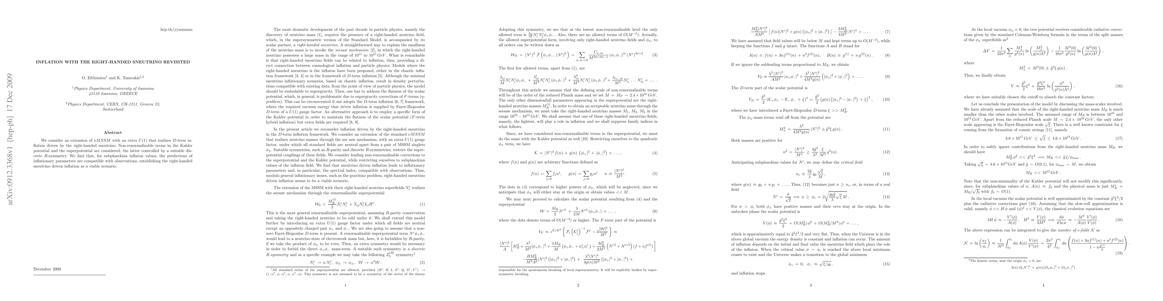 We consider an extension of nuMSSM with an extra U(1) that realizes D-term inflation driven by the right-handed sneutrino. Non-renormalizable terms in the Kahler potential and the superpotential are considered, the latter controlled by a suitable discrete R-symmetry. We find that, for subplanckian inflaton values, the predictions of inflationary parameters are compatible with observations, establishing the right-handed sneutrino driven inflation as a viable scenario.