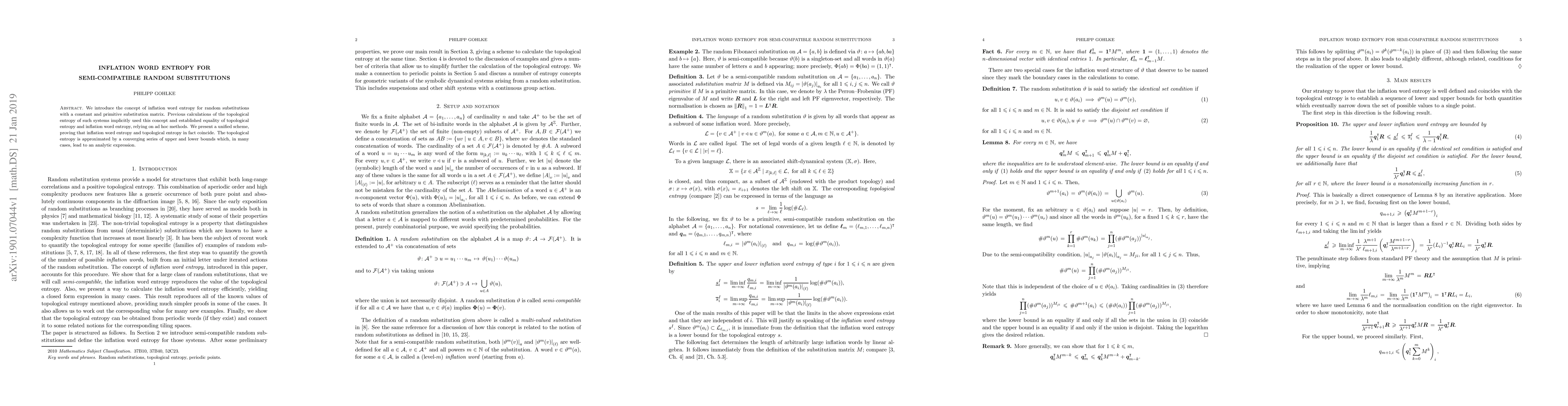 This paper introduces the inflation word entropy for semi-compatible random substitutions, proving its equivalence to topological entropy through a unified scheme. It also provides an analytic expression for the topological entropy via a converging series of upper and lower bounds.