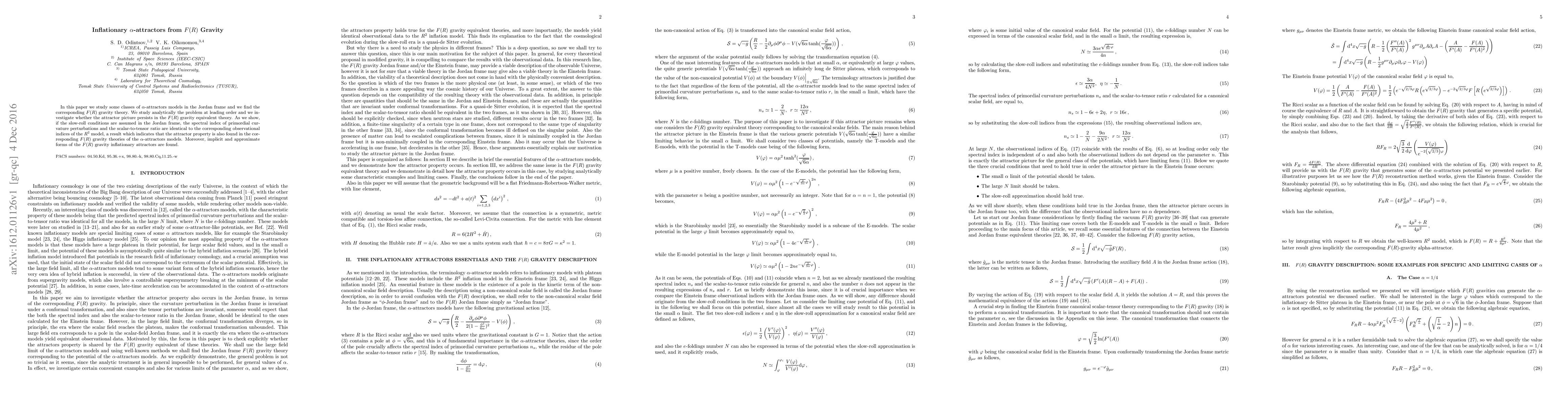 This paper investigates the $\alpha$-attractor models in the Jordan frame and their corresponding $F(R)$ gravity theories, finding that the attractor property persists. The study shows that under slow-roll conditions, the spectral index and scalar-to-tensor ratio in $F(R)$ gravity match those of the $R^2$ model, indicating the inflationary attractors' equivalence.