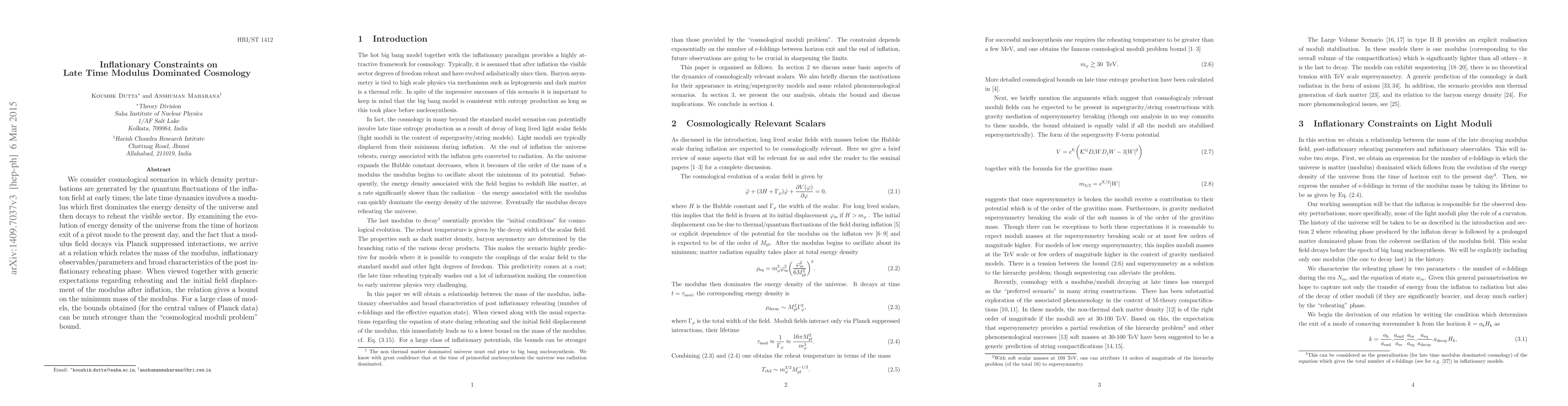 This paper sets bounds on the minimum mass of a modulus field that dominates late-time cosmology, potentially strengthening existing constraints on 'cosmological moduli problems'. The relation between the modulus's mass and inflationary parameters is derived from the universe's energy density evolution.