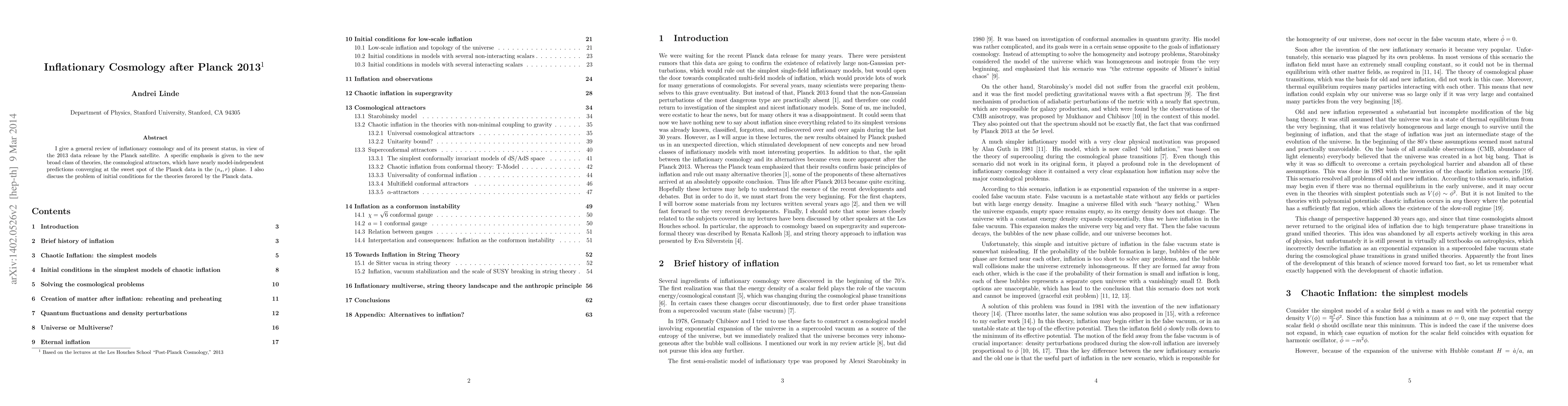 I give a general review of inflationary cosmology and of its present status, in view of the 2013 data release by the Planck satellite. A specific emphasis is given to the new broad class of theories, the cosmological attractors, which have nearly model-independent predictions converging at the sweet spot of the Planck data in the (n_s,r) plane. I also discuss the problem of initial conditions for the theories favored by the Planck data.