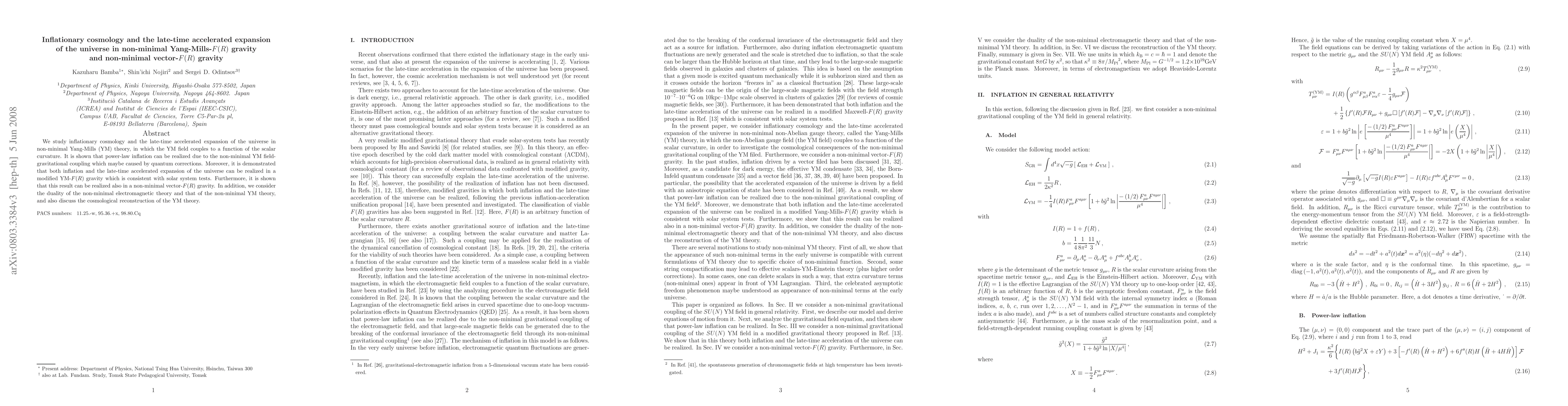 This paper explores inflationary cosmology and late-time accelerated expansion in non-minimal Yang-Mills $F(R)$ and vector $F(R)$ gravities, demonstrating that both phenomena can be achieved through non-minimal field-gravitational couplings and modifications consistent with solar system tests.