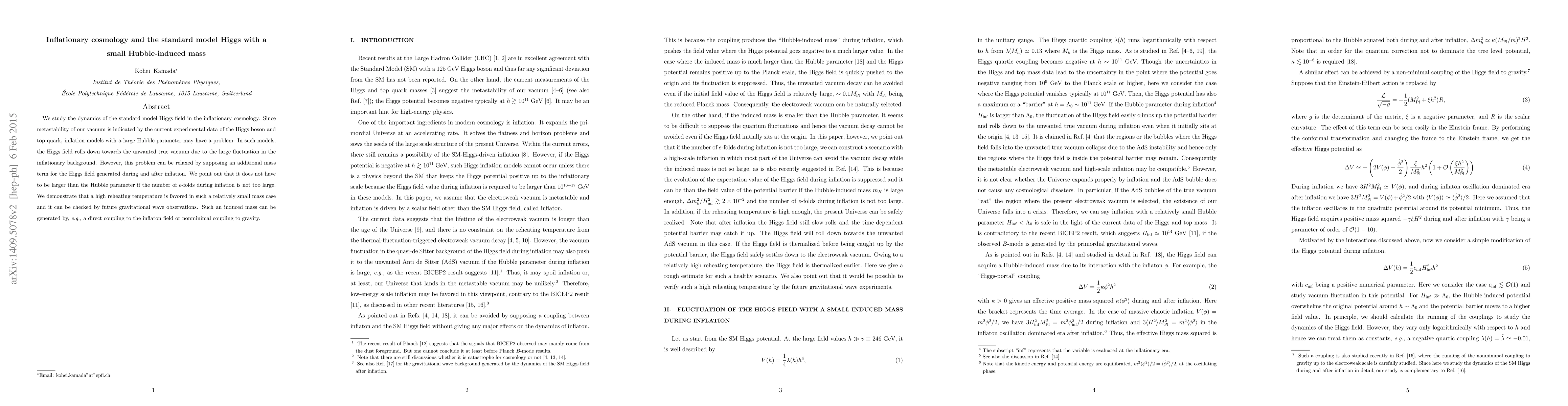 We study the dynamics of the standard model Higgs field in the inflationary cosmology. Since metastability of our vacuum is indicated by the current experimental data of the Higgs boson and top quark, inflation models with a large Hubble parameter may have a problem: In such models, the Higgs field rolls down towards the unwanted true vacuum due to the large fluctuation in the inflationary background. However, this problem can be relaxed by supposing an additional mass term for the Higgs field generated during and after inflation. We point out that it does not have to be larger than the Hubble parameter if the number of $e$-folds during inflation is not too large. We demonstrate that a high reheating temperature is favored in such a relatively small mass case and it can be checked by future gravitational wave observations. Such an induced mass can be generated by, {\it e.g.,} a direct coupling to the inflaton field or nonminimal coupling to gravity.