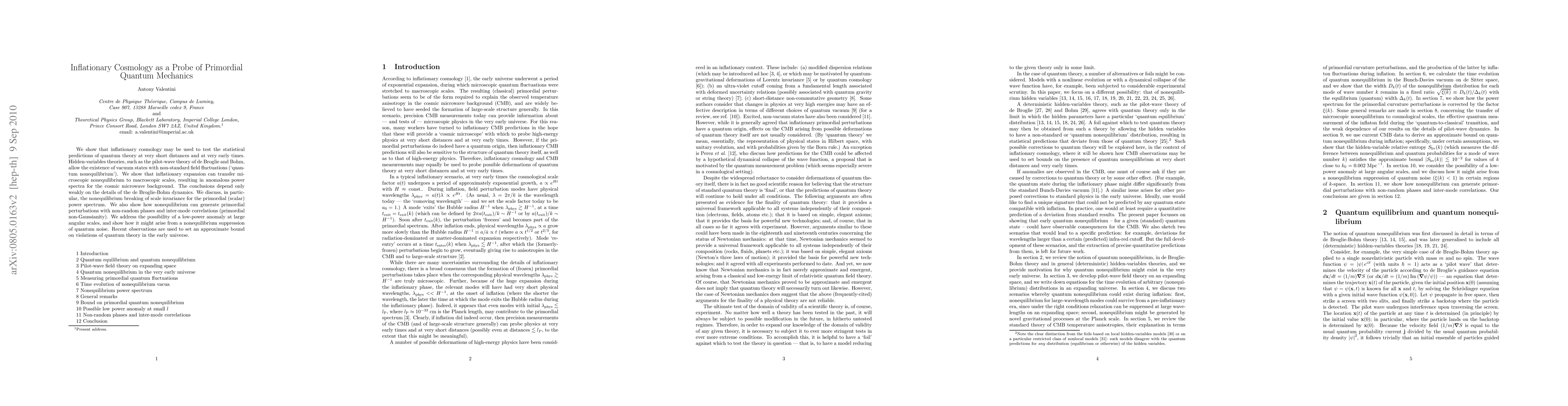 We show that inflationary cosmology may be used to test the statistical predictions of quantum theory at very short distances and at very early times. Hidden-variables theories, such as the pilot-wave theory of de Broglie and Bohm, allow the existence of vacuum states with non-standard field fluctuations ('quantum nonequilibrium'). We show that inflationary expansion can transfer microscopic nonequilibrium to macroscopic scales, resulting in anomalous power spectra for the cosmic microwave background. The conclusions depend only weakly on the details of the de Broglie-Bohm dynamics. We discuss, in particular, the nonequilibrium breaking of scale invariance for the primordial (scalar) power spectrum. We also show how nonequilibrium can generate primordial perturbations with non-random phases and inter-mode correlations (primordial non-Gaussianity). We address the possibility of a low-power anomaly at large angular scales, and show how it might arise from a nonequilibrium suppression of quantum noise. Recent observations are used to set an approximate bound on violations of quantum theory in the early universe.