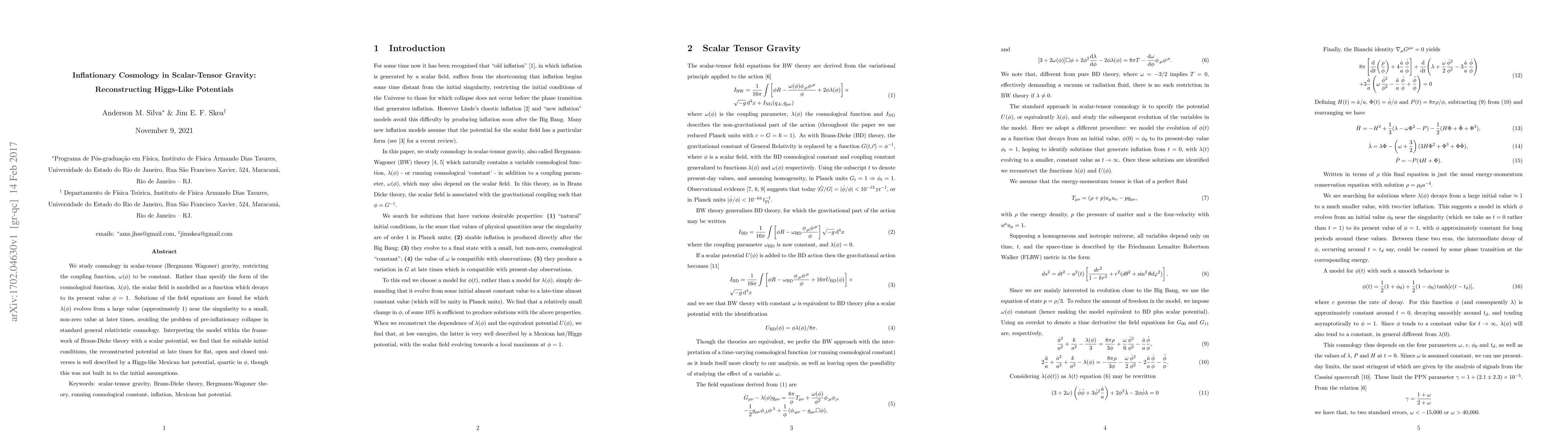 This paper explores inflationary cosmology in scalar-tensor gravity, finding solutions where the scalar field's potential evolves into a Higgs-like Mexican hat shape without explicitly incorporating it. This model avoids pre-inflationary collapse and describes the potential quartically in the scalar field.