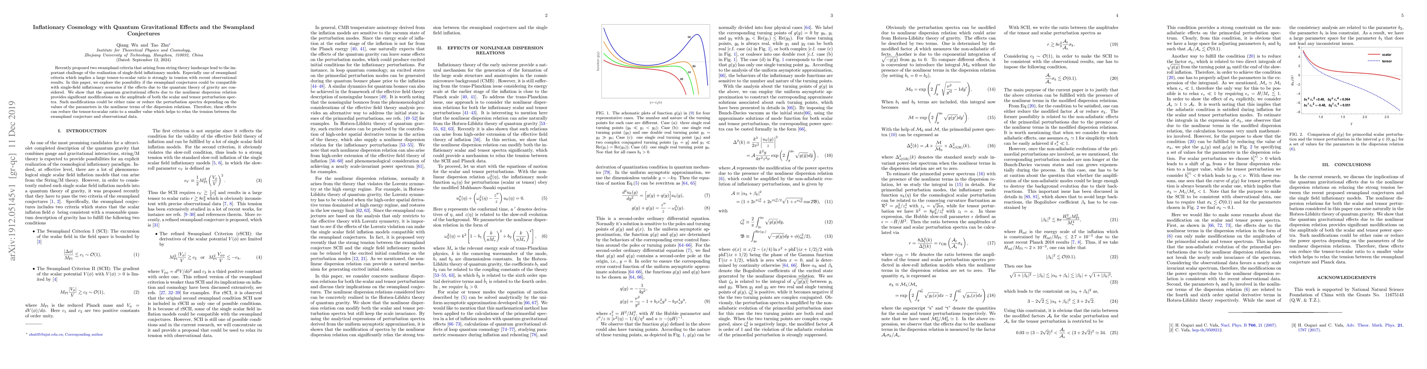 Recently proposed two swampland criteria that arising from string theory landscape lead to the important challenge of the realization of single-field inflationary models. Especially one of swampland criteria which implies a large tensor-to-scalar ratio is strongly in tension with recent observational results. In this paper, we explore the possibility if the swampland conjectures could be compatible with single-field inflationary scenarios if the effects due to the quantum theory of gravity are considered. We show that the quantum gravitational effects due to the nonlinear dispersion relation provides significant modifications on the amplitude of both the scalar and tensor perturbation spectra. Such modifications could be either raise or reduce the perturbation spectra depending on the values of the parameters in the nonlinear terms of the dispersion relations. Therefore, these effects can reduce the tensor-to-scalar ratio to a smaller value which helps to relax the tension between the swampland conjecture and observational data.