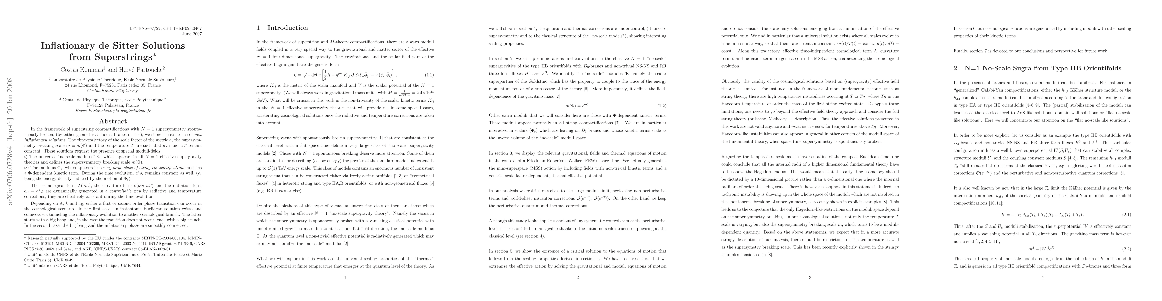 In the framework of superstring compactifications with N=1 supersymmetry spontaneously broken, (by either geometrical fluxes, branes or else), we show the existence of new inflationary solutions. The time-trajectory of the scale factor of the metric a, the supersymmetry breaking scale m=m(Phi) and the temperature T are such that am and aT remain constant. These solutions request the presence of special moduli-fields: i) The universal "no-scale-modulus" Phi, which appears in all N=1 effective supergravity theories and defines the supersymmetry breaking scale m(Phi). ii) The modulus Phi_s, which appears in a very large class of string compactifications and has a Phi-dependent kinetic term. During the time evolution, a^4 rho_s remains constant as well, (rho_s being the energy density induced by the motion of Phi_s). The cosmological term Lambda(am), the curvature term k(am, aT) and the radiation term c_R=a^4 rho are dynamically generated in a controllable way by radiative and temperature corrections; they are effectively constant during the time evolution. Depending on Lambda, k and c_R, either a first or second order phase transition can occur in the cosmological scenario. In the first case, an instantonic Euclidean solution exists and connects via tunneling the inflationary evolution to another cosmological branch. The latter starts with a big bang and, in the case the transition does not occur, ends with a big crunch. In the second case, the big bang and the inflationary phase are smoothly connected.