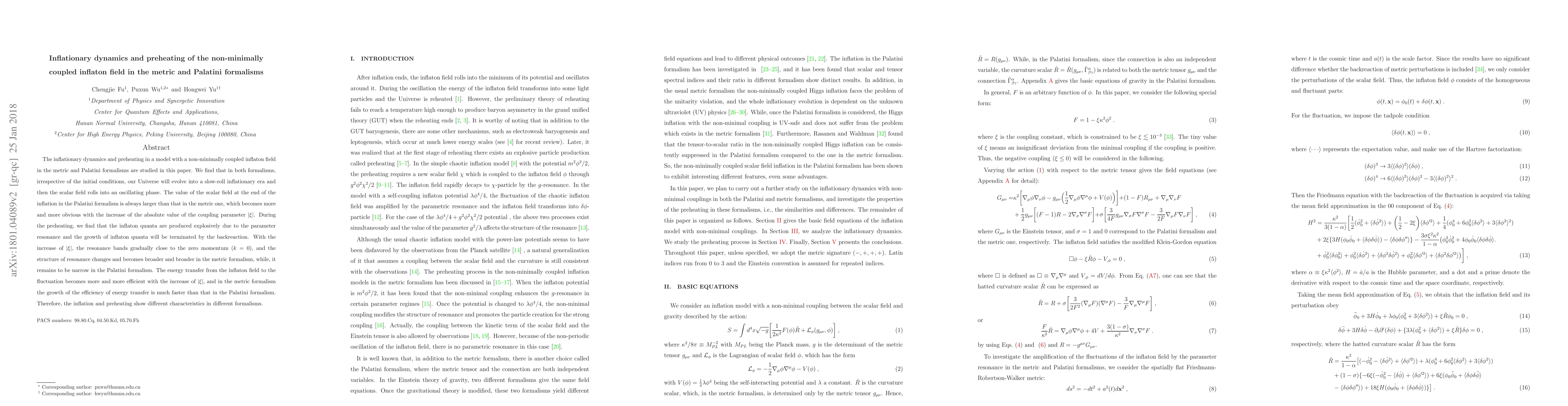 The inflationary dynamics and preheating in a model with a non-minimally coupled inflaton field in the metric and Palatini formalisms are studied in this paper. We find that in both formalisms, irrespective of the initial conditions, our Universe will evolve into a slow-roll inflationary era and then the scalar field rolls into an oscillating phase. The value of the scalar field at the end of the inflation in the Palatini formalism is always larger than that in the metric one, which becomes more and more obvious with the increase of the absolute value of the coupling parameter $|\xi|$. During the preheating, we find that the inflaton quanta are produced explosively due to the parameter resonance and the growth of inflaton quanta will be terminated by the backreaction. With the increase of $|\xi|$, the resonance bands gradually close to the zero momentum ($k=0$), and the structure of resonance changes and becomes broader and broader in the metric formalism, while, it remains to be narrow in the Palatini formalism. The energy transfer from the inflaton field to the fluctuation becomes more and more efficient with the increase of $|\xi|$, and in the metric formalism the growth of the efficiency of energy transfer is much faster than that in the Palatini formalism. Therefore, the inflation and preheating show different characteristics in different formalisms.