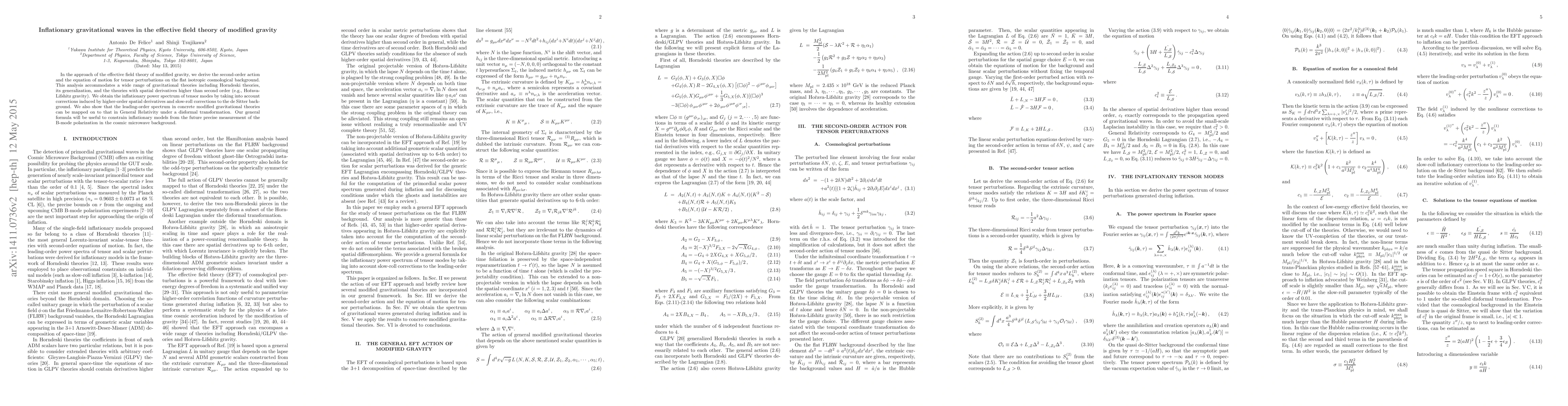 This paper derives the second-order action and equations of motion for tensor perturbations in the effective field theory of modified gravity, encompassing various theories including Horndeski and Horava-Lifshitz. It calculates the inflationary tensor power spectrum, accounting for higher-order derivative corrections, and shows that modified gravity spectra can be mapped to General Relativity under disformal transformations, aiding future constraints on inflationary models via CMB B-mode polarization measurements.