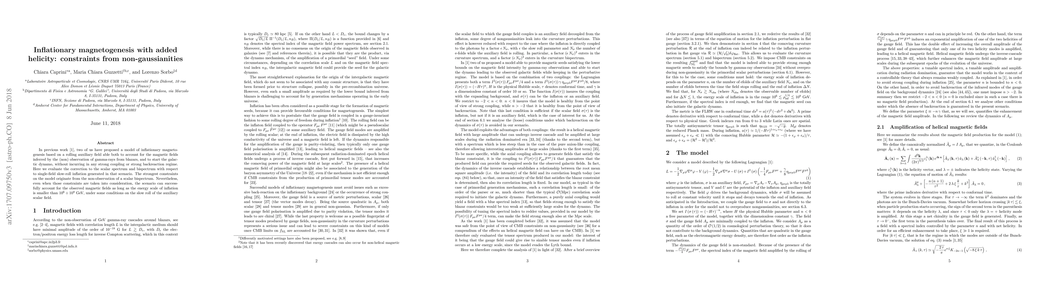 In previous work, two of us have proposed a model of inflationary magnetogenesis based on a rolling auxiliary field able both to account for the magnetic fields inferred by the (non) observation of gamma-rays from blazars, and to start the galactic dynamo, without incurring in any strong coupling or strong backreaction regime. Here we evaluate the correction to the scalar spectrum and bispectrum with respect to single-field slow-roll inflation generated in that scenario. The strongest constraints on the model originate from the non-observation of a scalar bispectrum. Nevertheless, even when those constraints are taken into consideration, the scenario can successfully account for the observed magnetic fields as long as the energy scale of inflation is smaller than $10^6\div10^8$~GeV, under some conditions on the slow roll of the auxiliary scalar field.