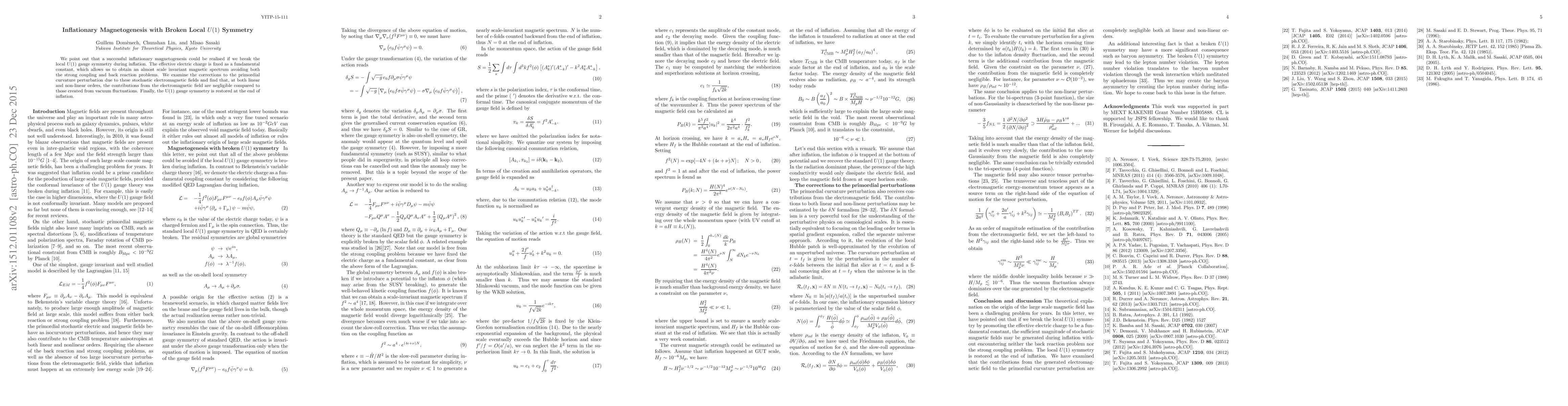 The paper proposes a successful inflationary magnetogenesis model by breaking local U(1) gauge symmetry during inflation, resulting in an almost scale-invariant magnetic spectrum without strong coupling or back reaction issues. It shows that electromagnetic field contributions to primordial curvature perturbations are negligible and that the U(1) gauge symmetry is restored post-inflation.