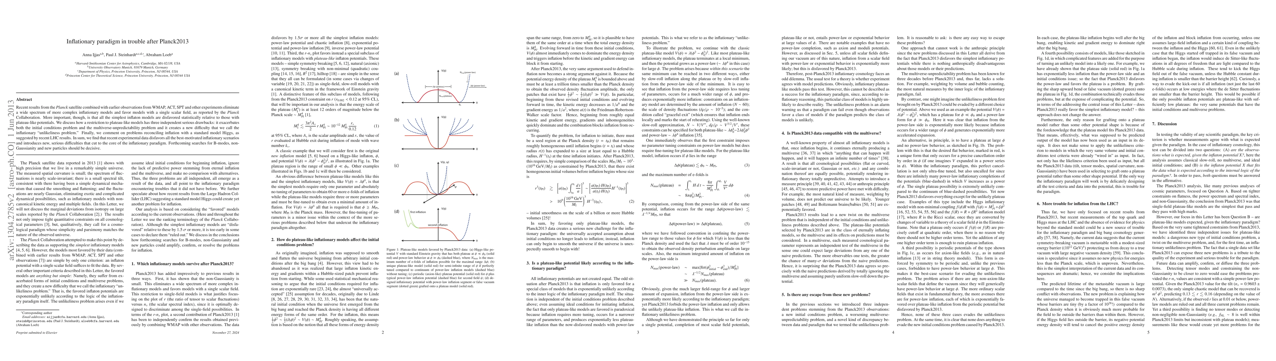 Recent results from the Planck satellite combined with earlier observations from WMAP, ACT, SPT and other experiments eliminate a wide spectrum of more complex inflationary models and favor models with a single scalar field, as reported by the Planck Collaboration. More important, though, is that all the simplest inflaton models are disfavored statistically relative to those with plateau-like potentials. We discuss how a restriction to plateau-like models has three independent serious drawbacks: it exacerbates both the initial conditions problem and the multiverse-unpredictability problem and it creates a new difficulty that we call the inflationary "unlikeliness problem." Finally, we comment on problems reconciling inflation with a standard model Higgs, as suggested by recent LHC results. In sum, we find that recent experimental data disfavors all the best-motivated inflationary scenarios and introduces new, serious difficulties that cut to the core of the inflationary paradigm. Forthcoming searches for B-modes, non-Gaussianity and new particles should be decisive.