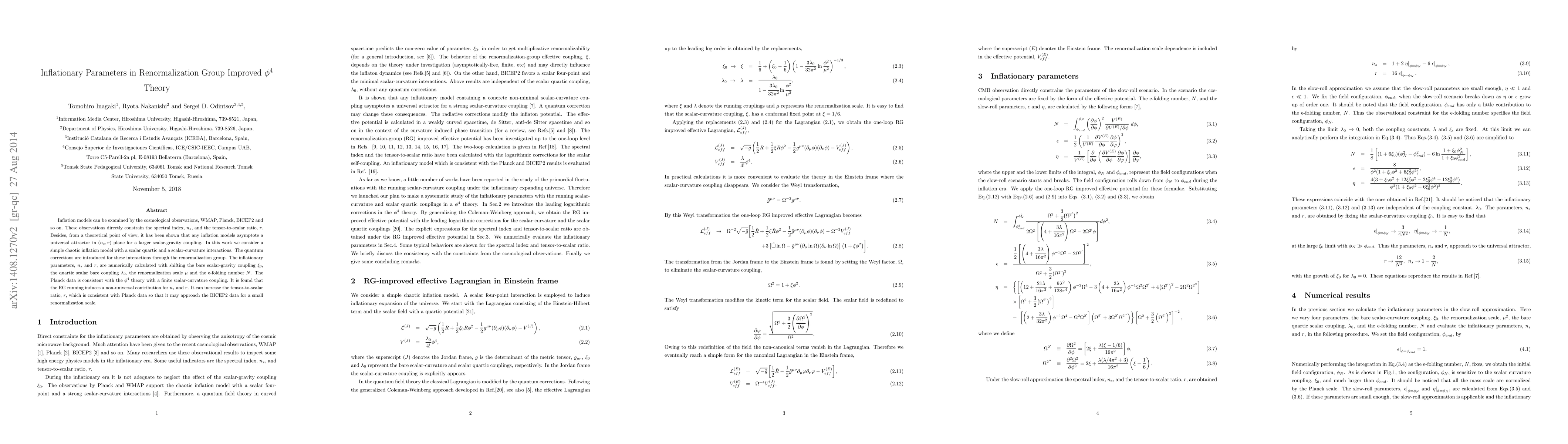 This paper investigates inflationary parameters in a $\phi^4$ theory with renormalization group improvements, finding that quantum corrections can modify the spectral index $n_s$ and tensor-to-scalar ratio $r$. The study shows that RG running can increase $r$, aligning with Planck data and potentially approaching BICEP2 results for a small renormalization scale.
