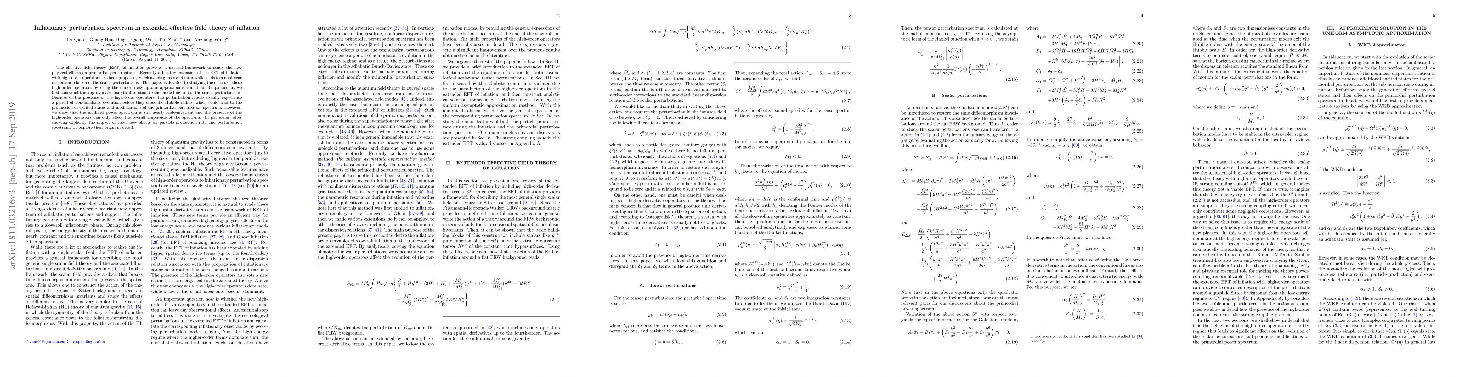 This paper investigates the inflationary perturbation spectrum within an extended effective field theory framework, revealing that high-order operators lead to non-adiabatic evolution and excited state production, but maintain a nearly scale-invariant power spectrum primarily affecting the overall amplitude. The study employs the uniform asymptotic approximation method to derive analytical solutions.