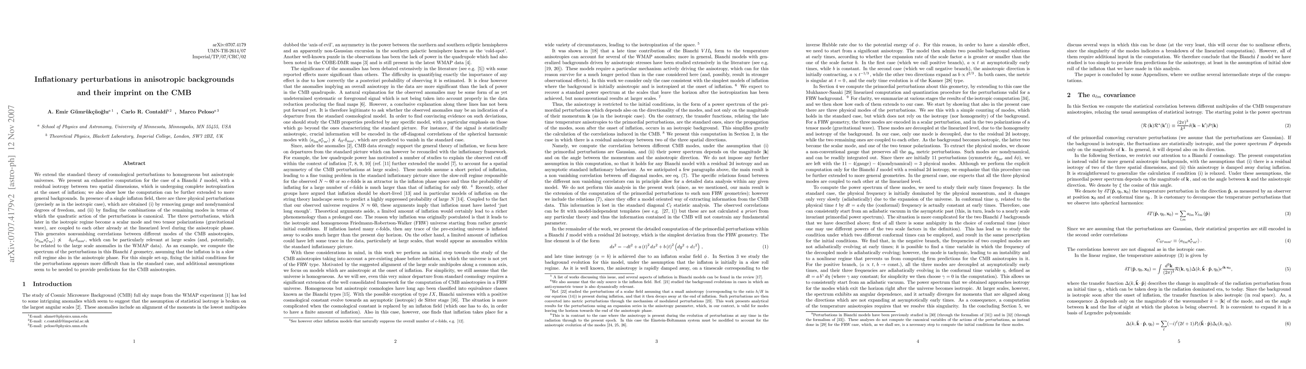 We extend the standard theory of cosmological perturbations to homogeneous but anisotropic universes. We present an exhaustive computation for the case of a Bianchi I model, with a residual isotropy between two spatial dimensions, which is undergoing complete isotropization at the onset of inflation; we also show how the computation can be further extended to more general backgrounds. In presence of a single inflaton field, there are three physical perturbations (precisely as in the isotropic case), which are obtained (i) by removing gauge and nondynamical degrees of freedom, and (ii) by finding the combinations of the remaining modes in terms of which the quadratic action of the perturbations is canonical. The three perturbations, which later in the isotropic regime become a scalar mode and two tensor polarizations (gravitational wave), are coupled to each other already at the linearized level during the anisotropic phase. This generates nonvanishing correlations between different modes of the CMB anisotropies, which can be particularly relevant at large scales (and, potentially, be related to the large scale anomalies in the WMAP data). As an example, we compute the spectrum of the perturbations in this Bianchi I geometry, assuming that the inflaton is in a slow roll regime also in the anisotropic phase. For this simple set-up, fixing the initial conditions for the perturbations appears more difficult than in the standard case, and additional assumptions seem to be needed to provide predictions for the CMB anisotropies.