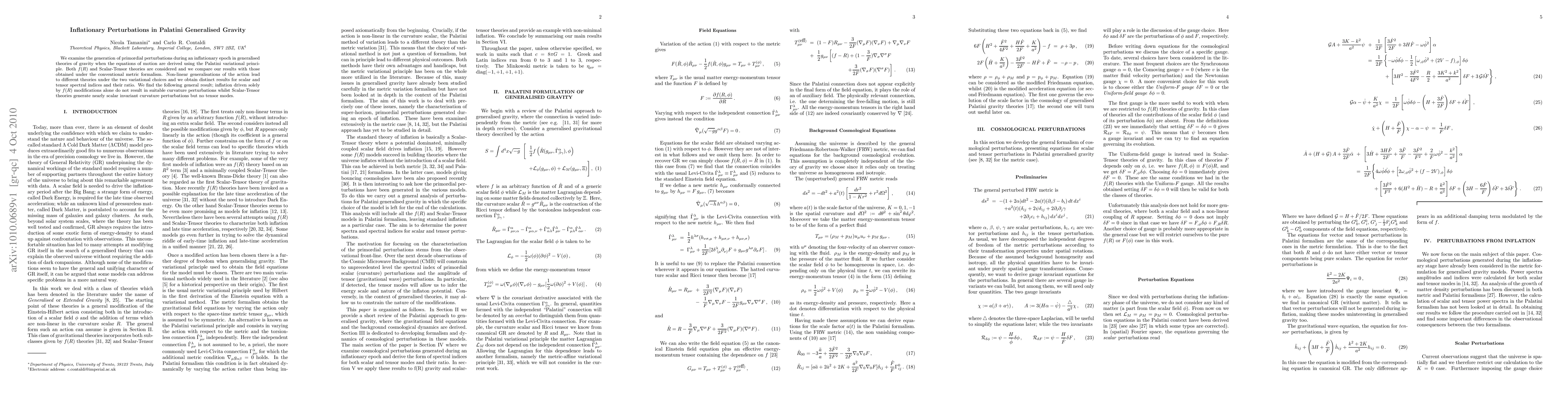 This paper investigates inflationary perturbations in generalised gravity using the Palatini variational principle, comparing f(R) and Scalar-Tensor theories against metric formalism results. It finds that f(R) modifications alone do not produce suitable curvature perturbations, while Scalar-Tensor theories generate nearly scalar invariant curvature perturbations without tensor modes.