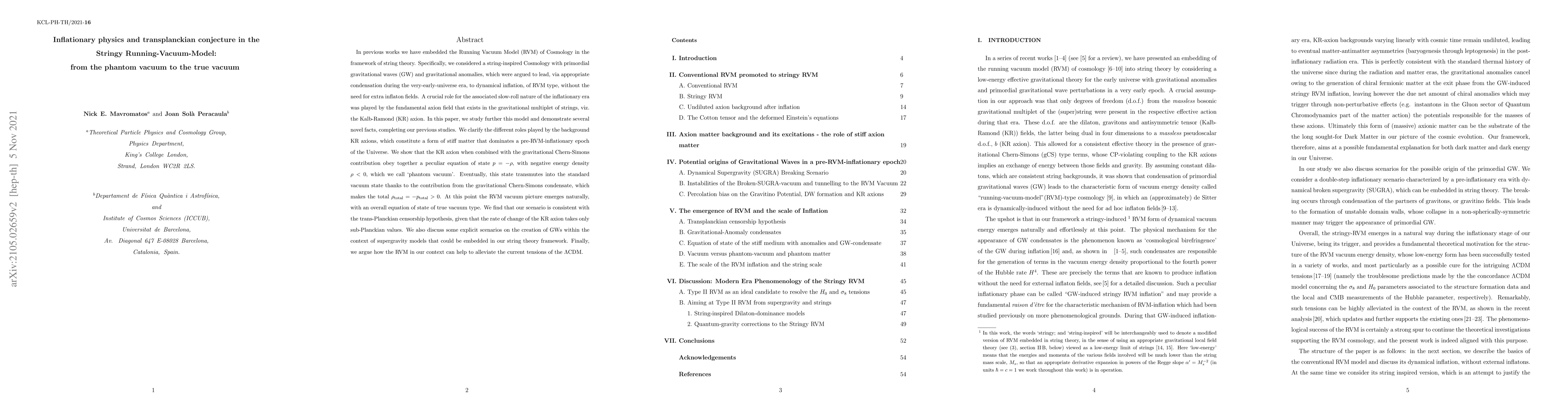 This paper extends a string theory-based Running Vacuum Model (RVM) of cosmology, demonstrating how the Kalb-Ramond (KR) axion and the gravitational Chern-Simons term lead to a transition from a "phantom vacuum" to a true vacuum state, consistent with inflationary dynamics and the trans-Planckian censorship conjecture.