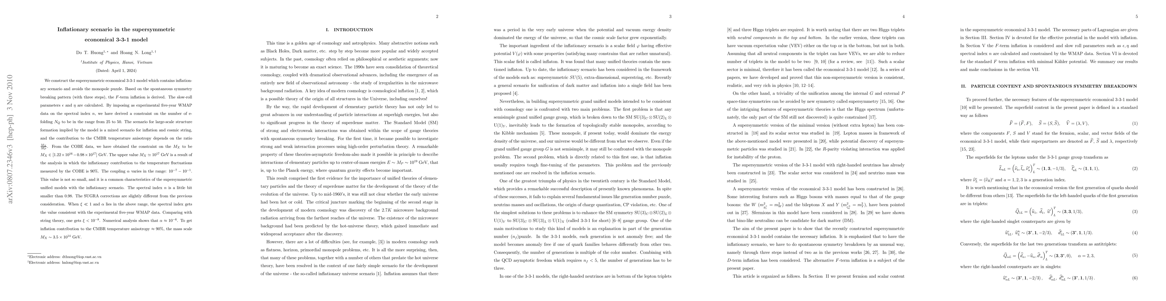 We construct the supersymmetric economical 3-3-1 model which contains inflationary scenario and avoids the monopole puzzle. Based on the spontaneous symmetry breaking pattern (with three steps), the $F$-term inflation is derived. The slow-roll parameters $\ep$ and $\eta$ are calculated. By imposing as experimental five-year WMAP data on the spectral index $n$, we have derived a constraint on the number of e-folding $N_Q$ to be in the range from 25 to 50. The scenario for large-scale structure formation implied by the model is a mixed scenario for inflation and cosmic string, and the contribution to the CMBR temperature anisotropy depends on the ratio $\frac{M_X}{M_P}$. From the COBE data, we have obtained the constraint on the $M_X$ to be $M_X\in[1.22 \times 10^{16} - 0.98 \times 10^{17}]$ GeV. The upper value $M_X\simeq 10^{17}$ GeV is a result of the analysis in which the inflationary contribution to the temperature fluctuations measured by the COBE is 90%. The coupling $\alpha$ varies in the range: $ 10^{-7} - 10^{-1} $. This value is not so small, and it is a common characteristics of the supersymmetric unified models with the inflationary scenario. The spectral index $n$ is a little bit smaller than 0.98. The SUGRA corrections are slightly different from the previous consideration. When $\xi \ll 1$ and $ \al $ lies in the above range, the spectral index gets the value consistent with the experimental five-year WMAP data. Comparing with string theory, one gets $\xi < 10^{-8}$. Numerical analysis shows that $ \al \approx 10^{-6}$. To get inflation contribution to the CMBR temperature anisotropy $\approx 90%$, the mass scale $M_X \sim 3.5 \times 10^{14}$ GeV.
