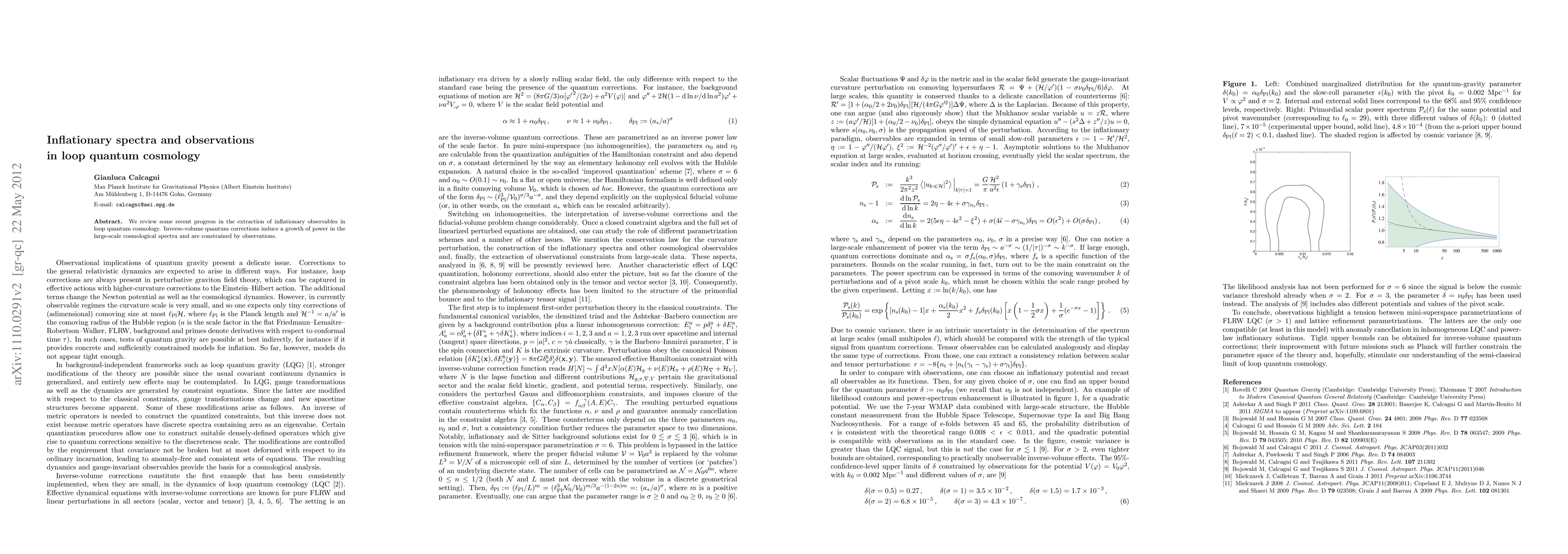 We review some recent progress in the extraction of inflationary observables in loop quantum cosmology. Inverse-volume quantum corrections induce a growth of power in the large-scale cosmological spectra and are constrained by observations.