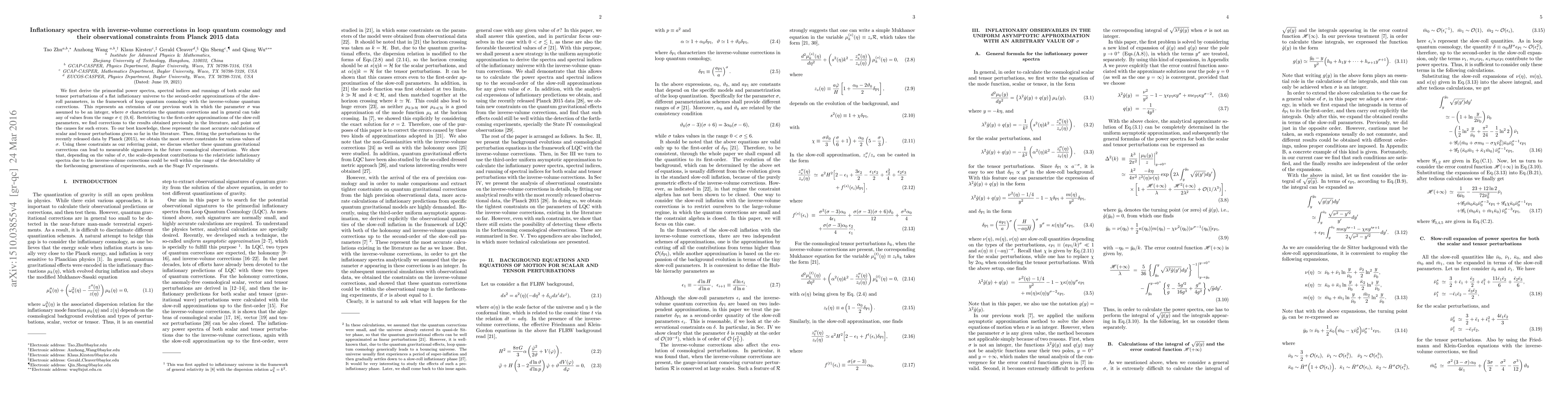 We first derive the primordial power spectra, spectral indices and runnings of both scalar and tensor perturbations of a flat inflationary universe to the second-order approximations of the slow-roll parameters, in the framework of loop quantum cosmology with the inverse-volume quantum corrections. This represents an extension of our previous work in which the parameter $\sigma$ was assumed to be an integer, where $\sigma$ characterizes the quantum corrections and in general can take any of values from the range $\sigma \in (0, 6]$. Restricting to the first-order approximations of the slow-roll parameters, we find corrections to the results obtained previously in the literature, and point out the causes for such errors. To our best knowledge, these represent the most accurate calculations of scalar and tensor perturbations given so far in the literature. Then, fitting the perturbations to the recently released data by Planck (2015), we obtain the most severe constraints for various values of $\sigma$. Using these constraints as our referring point, we discuss whether these quantum gravitational corrections can lead to measurable signatures in the future cosmological observations. We show that, depending on the value of $\sigma$, the scale-dependent contributions to the relativistic inflationary spectra due to the inverse-volume corrections could be well within the range of the detectability of the forthcoming generations of experiments, such as the Stage IV experiments.