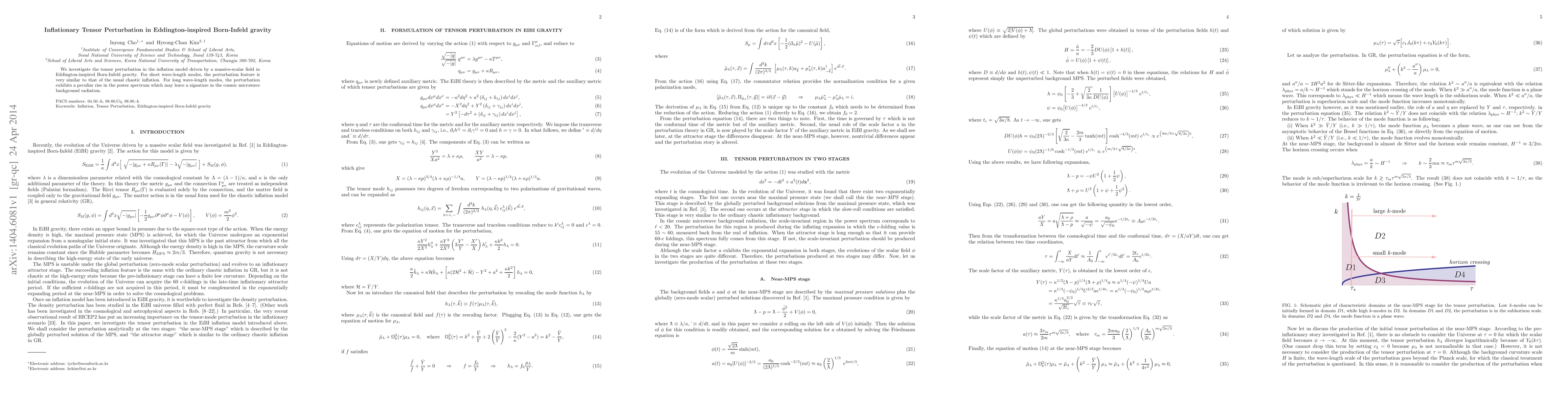 We investigate the tensor perturbation in the inflation model driven by a massive-scalar field in Eddington-inspired Born-Infeld gravity. For short wave-length modes, the perturbation feature is very similar to that of the usual chaotic inflation. For long wave-length modes, the perturbation exhibits a peculiar rise in the power spectrum which may leave a signature in the cosmic microwave background radiation.