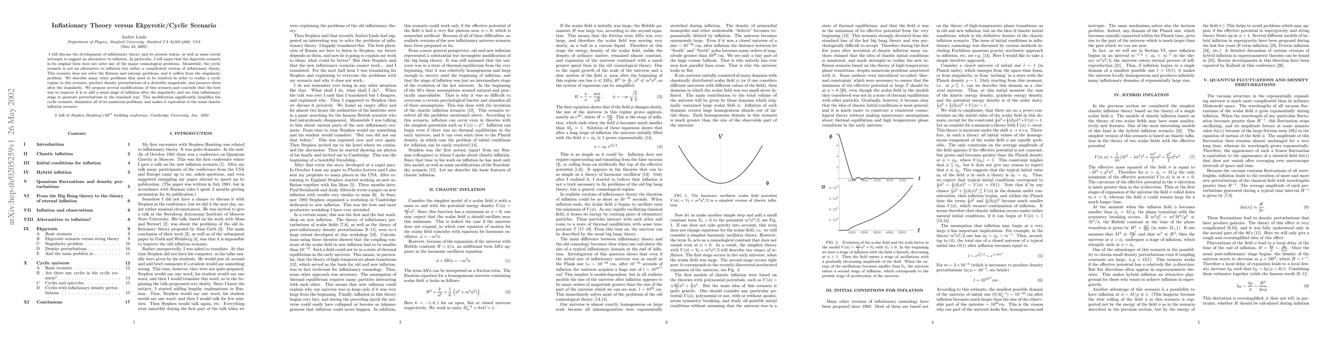 I will discuss the development of inflationary theory and its present status, as well as some recent attempts to suggest an alternative to inflation. In particular, I will argue that the ekpyrotic scenario in its original form does not solve any of the major cosmological problems. Meanwhile, the cyclic scenario is not an alternative to inflation but rather a complicated version of inflationary theory. This scenario does not solve the flatness and entropy problems, and it suffers from the singularity problem. We describe many other problems that need to be resolved in order to realize a cyclic regime in this scenario, produce density perturbations of a desirable magnitude, and preserve them after the singularity. We propose several modifications of this scenario and conclude that the best way to improve it is to add a usual stage of inflation after the singularity and use that inflationary stage to generate perturbations in the standard way. This modification significantly simplifies the cyclic scenario, eliminates all of its numerous problems, and makes it equivalent to the usual chaotic inflation scenario.