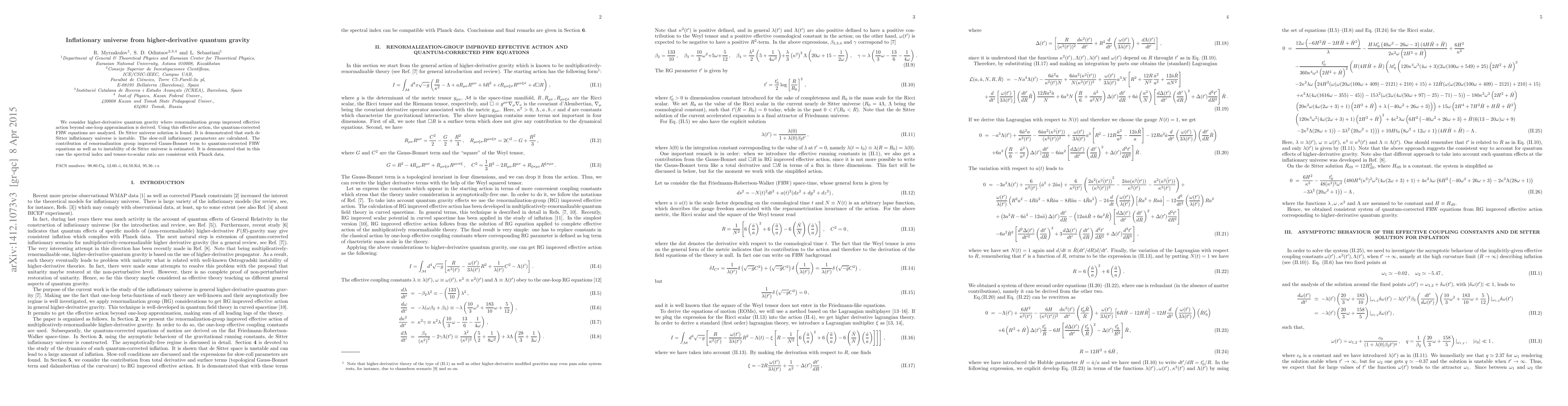 This paper explores higher-derivative quantum gravity to derive a renormalization group improved effective action, revealing a de Sitter universe solution that is unstable. It calculates slow-roll inflationary parameters and estimates the Gauss-Bonnet term's contribution, showing consistency with Planck data for the spectral index and tensor-to-scalar ratio.
