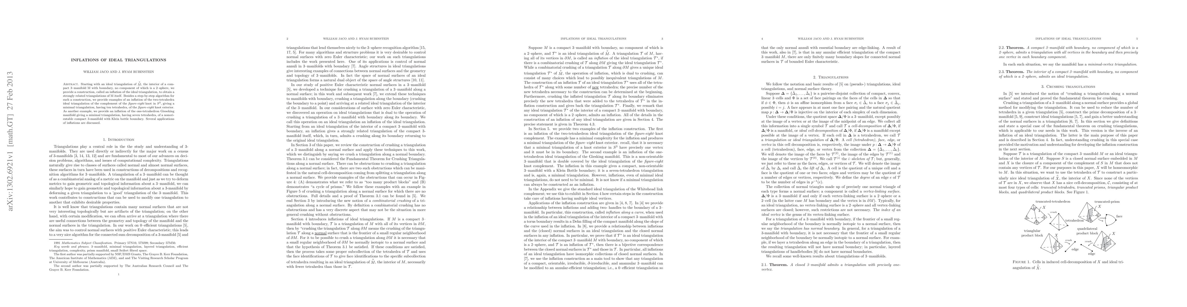 Starting with an ideal triangulation of the interior of a compact 3-manifold M with boundary, no component of which is a 2-sphere, we provide a construction, called an inflation of the ideal triangulation, to obtain a strongly related triangulations of M itself. Besides a step-by-step algorithm for such a construction, we provide examples of an inflation of the two-tetrahedra ideal triangulation of the complement of the figure-eight knot in the 3-sphere, giving a minimal triangulation, having ten tetrahedra, of the figure-eight knot exterior. As another example, we provide an inflation of the one-tetrahedron Gieseking manifold giving a minimal triangulation, having seven tetrahedra, of a nonorientable compact 3-manifold with Klein bottle boundary. Several applications of inflations are discussed.