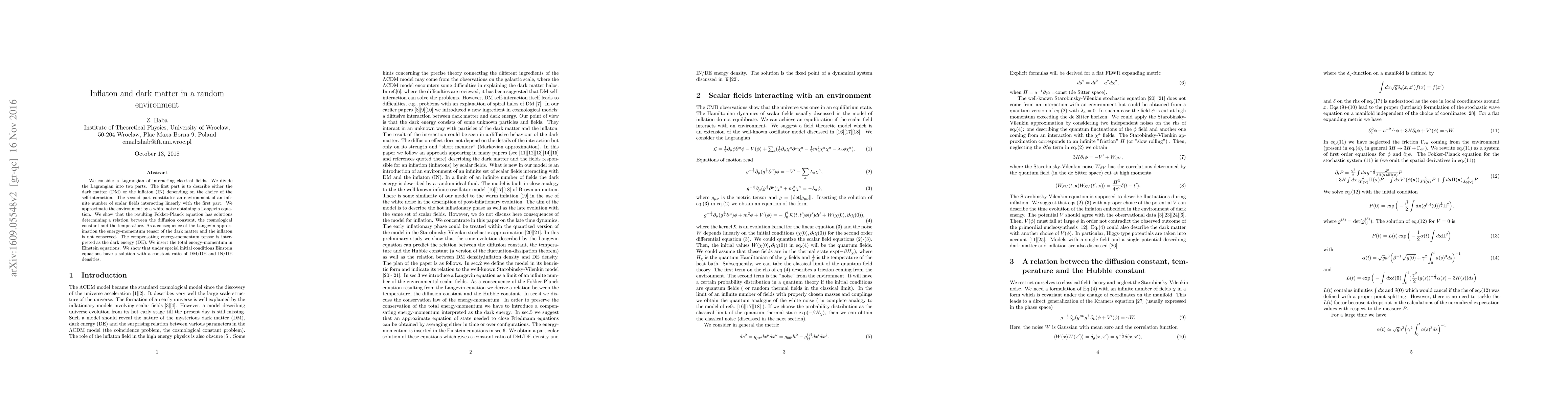 We consider a Lagrangian of interacting scalar fields. We divide the Lagrangian into two parts. The first part is to describe either the dark matter (DM) or the inflaton (IN) depending on the choice of the self-interaction. The second part constitutes an environment of an infinite number of scalar fields interacting linearly with the first part. We approximate the environment by a white noise obtaining a Langevin equation. We show that the resulting Fokker-Planck equation has solutions determining a relation between the diffusion constant, the cosmological constant and the temperature. As a consequence of the Langevin approximation the energy-momentum tensor of the dark matter and the inflaton is not conserved. The compensating energy-momentum tensor is interpreted as the dark energy (DE). We insert the total energy-momentum in Einstein equations. We show that under special initial conditions Einstein equations have a solution with a constant ratio of DM/DE and IN/DE densities.