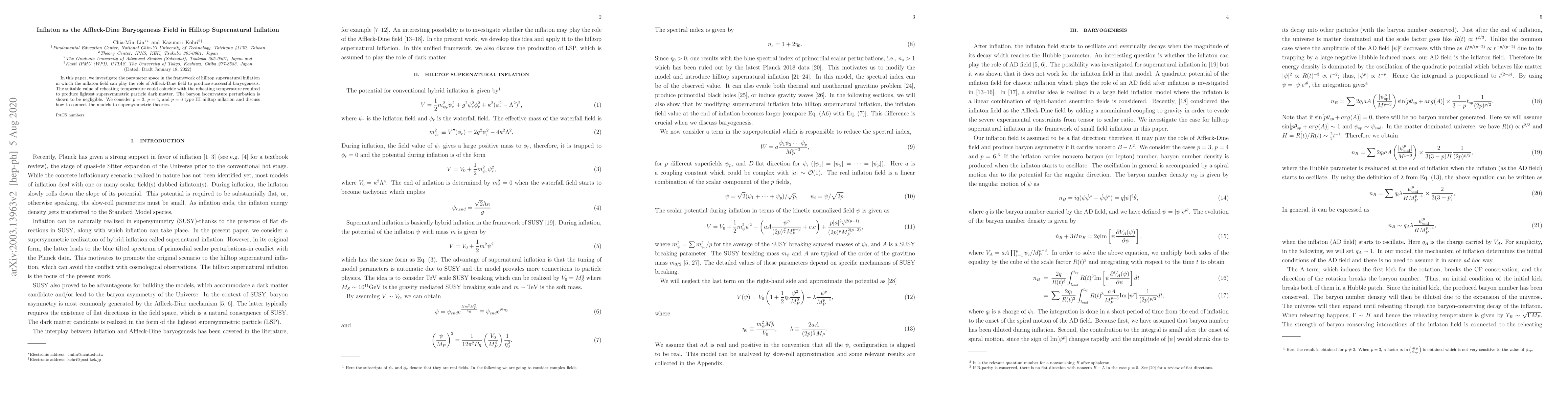 This paper explores the potential of the inflaton field in hilltop supernatural inflation to act as the Affleck-Dine field for successful baryogenesis, while ensuring negligible baryon isocurvature perturbations. It connects $p=3$, $p=4$, and $p=6$ type III hilltop inflation models to supersymmetric theories, aligning the reheating temperature for both baryogenesis and dark matter production.