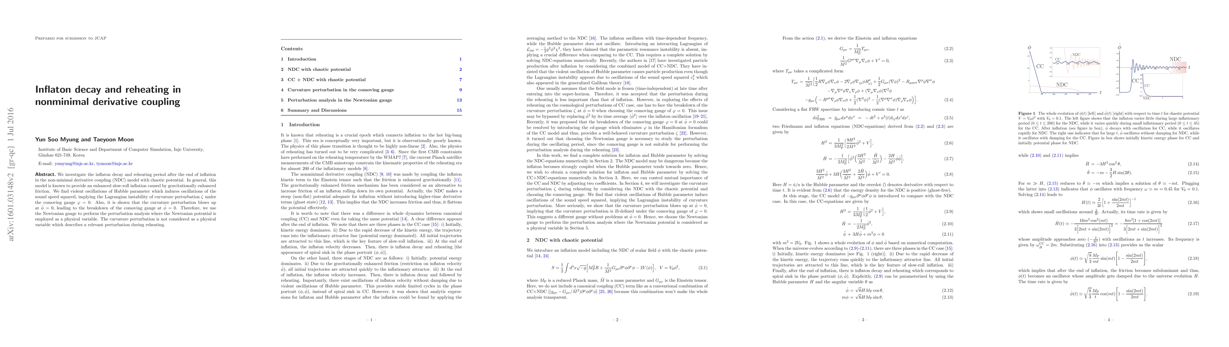 This paper explores inflaton decay and reheating dynamics in a nonminimal derivative coupling (NDC) model with chaotic potential, revealing violent Hubble oscillations and Lagrangian instability of curvature perturbations. The study employs the Newtonian gauge for perturbation analysis, as the comoving gauge fails at $\dot{\phi}=0$.