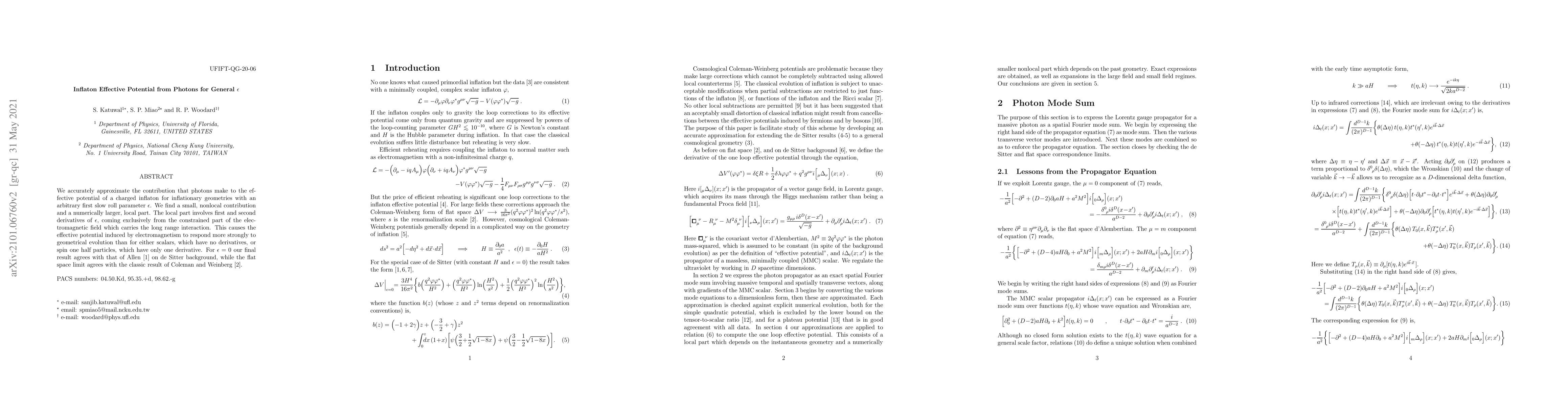 We accurately approximate the contribution that photons make to the effective potential of a charged inflaton for inflationary geometries with an arbitrary first slow roll parameter $\epsilon$. We find a small, nonlocal contribution and a numerically larger, local part. The local part involves first and second derivatives of $\epsilon$, coming exclusively from the constrained part of the electromagnetic field which carries the long range interaction. This causes the effective potential induced by electromagnetism to respond more strongly to geometrical evolution than for either scalars, which have no derivatives, or spin one half particles, which have only one derivative. For $\epsilon = 0$ our final result agrees with that of Allen on de Sitter background, while the flat space limit agrees with the classic result of Coleman and Weinberg.
