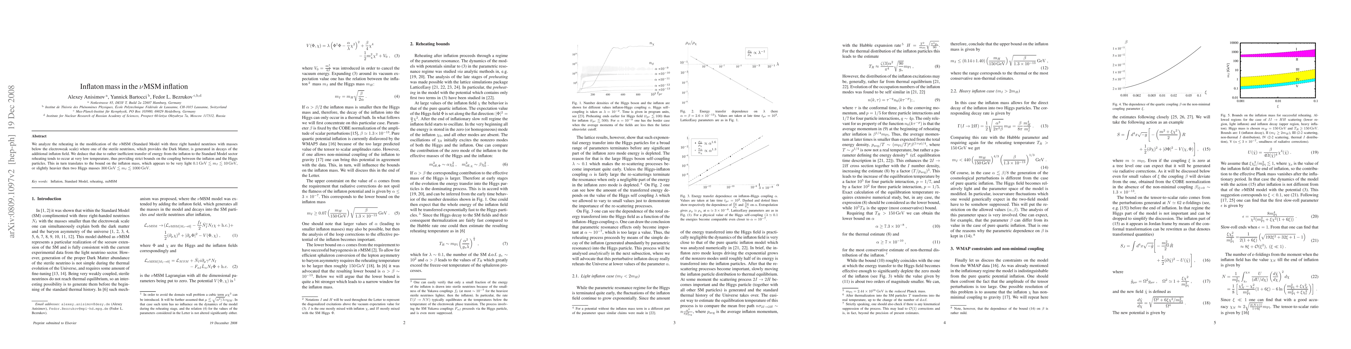 We analyse the reheating in the modification of \nuMSM (Standard Model with three right handed neutrinos with masses below the electroweak scale) where the sterile neutrino providing the Dark Matter is generated in decays of the additional inflaton field. We deduce that due to rather inefficient transfer of energy from the inflaton to the Standard Model sector reheating tends to happen at very low temperature, thus providing strict bounds on the coupling between the inflaton and the Higgs particles. This in turn translates to the bound on the inflaton mass, which appears to be very light 0.1 GeV <~ m_I <~ 10 GeV, or slightly heavier then two Higgs masses 300 GeV <~ m_I <~ 1000 GeV.